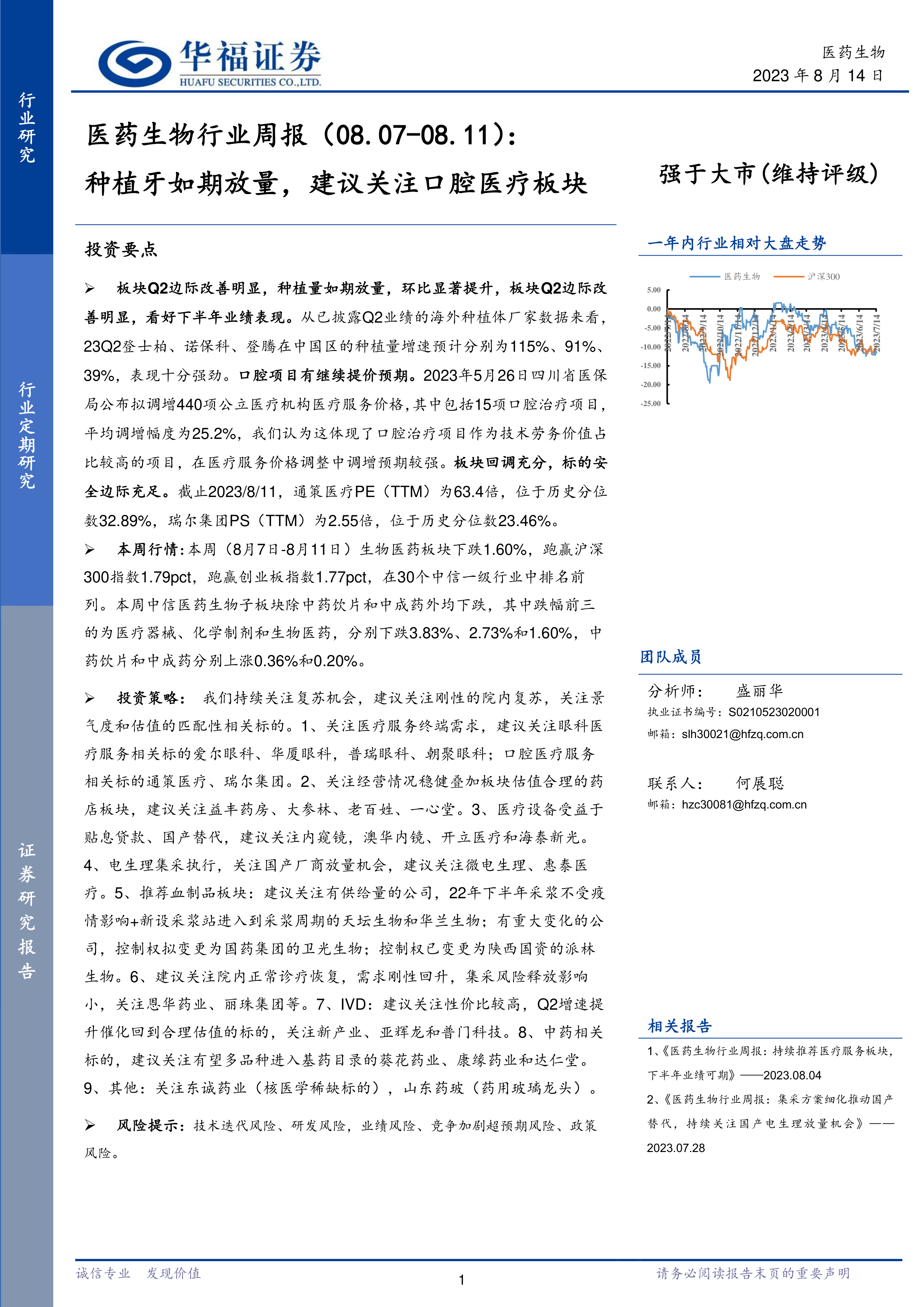 本报告的核心观点是:医药生物板块Q2业绩边际改善明显,种植牙放量增长显著,口腔医疗板块值得关注;同时,报告分析了本周医药行情,重点事件以及行业投资建议,并提示了相关风险。