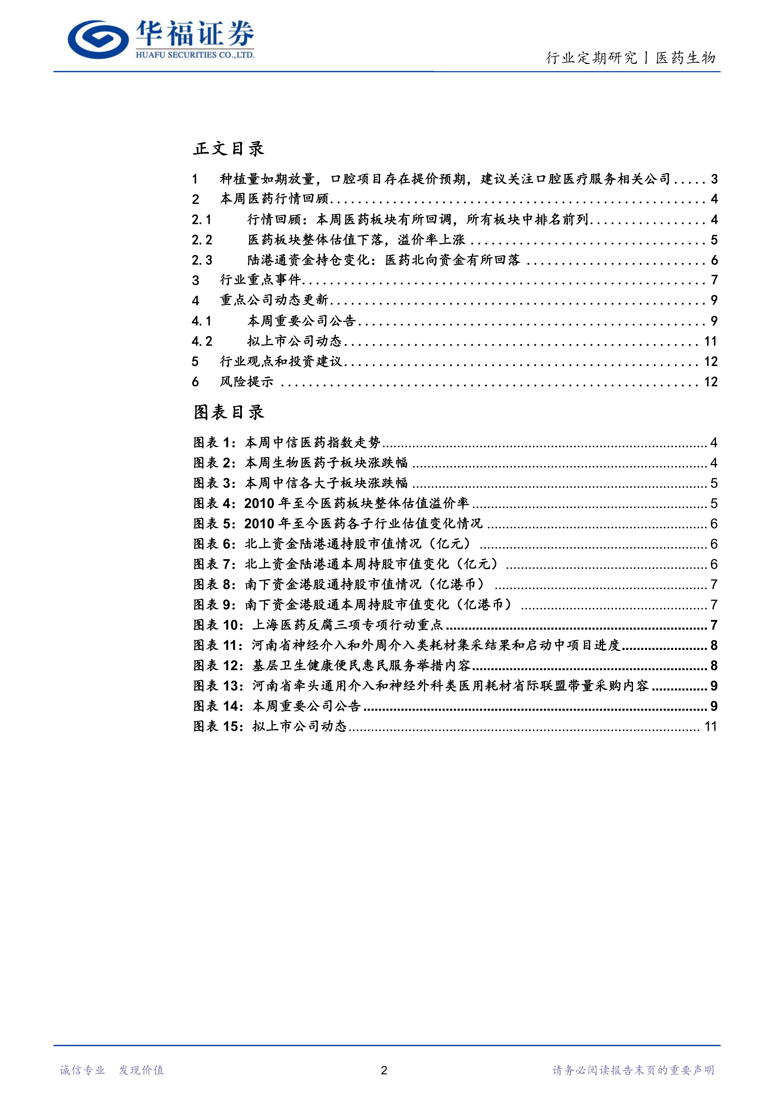 本节回顾了本周医药板块的行情表现,包括板块整体涨跌幅、各子板块的涨跌幅以及个股的涨跌幅。数据显示,本周医药板块整体有所回调,但跑赢了沪深300和创业板指数。部分子板块跌幅较大,例如医疗器械、化学制剂和生物医药,而中药饮片和中成药则有所上涨。 此外,本节还分析了医药板块的估值变化和陆港通资金的持仓变化。
