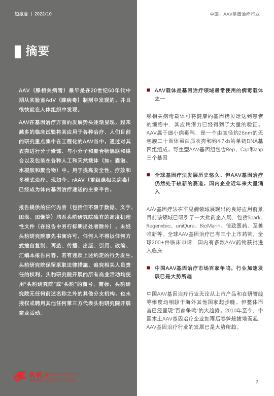 本报告的核心观点是:中国AAV基因治疗行业虽然起步较晚,但发展迅速,呈现“百家争鸣”的态势。AAV载体作为基因治疗领域最常用的病毒载体之一,具有诸多优势,在罕见病、眼科疾病等领域应用前景广阔。然而,中国市场与海外市场相比,在上市产品和在研管线方面仍存在差距。未来,政策支持、技术创新和企业竞争将共同塑造中国AAV基因治疗行业的市场格局。
