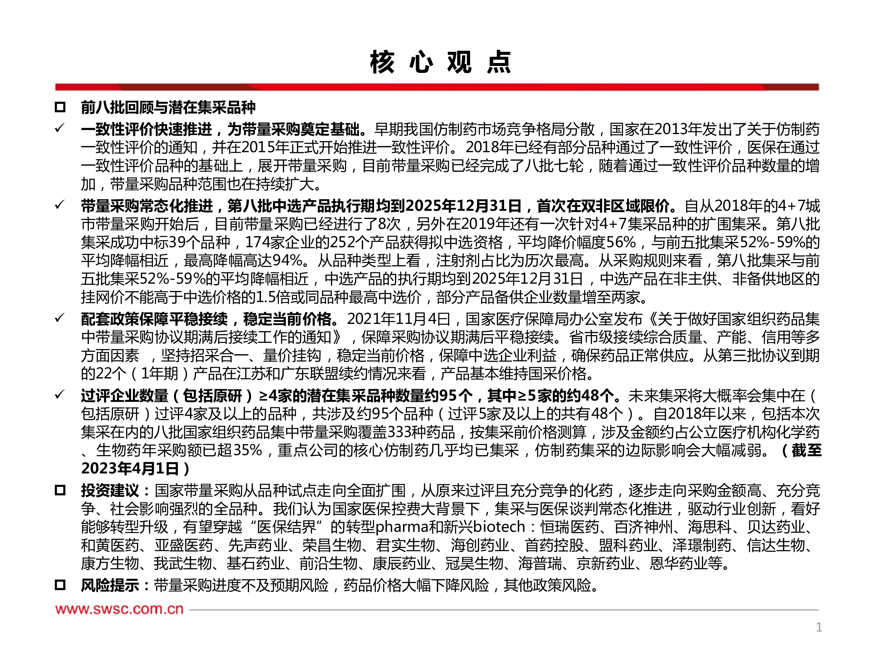 风险提示:带量采购进度不及预期风险,药品价格大幅下降风险,其他政策风险。
