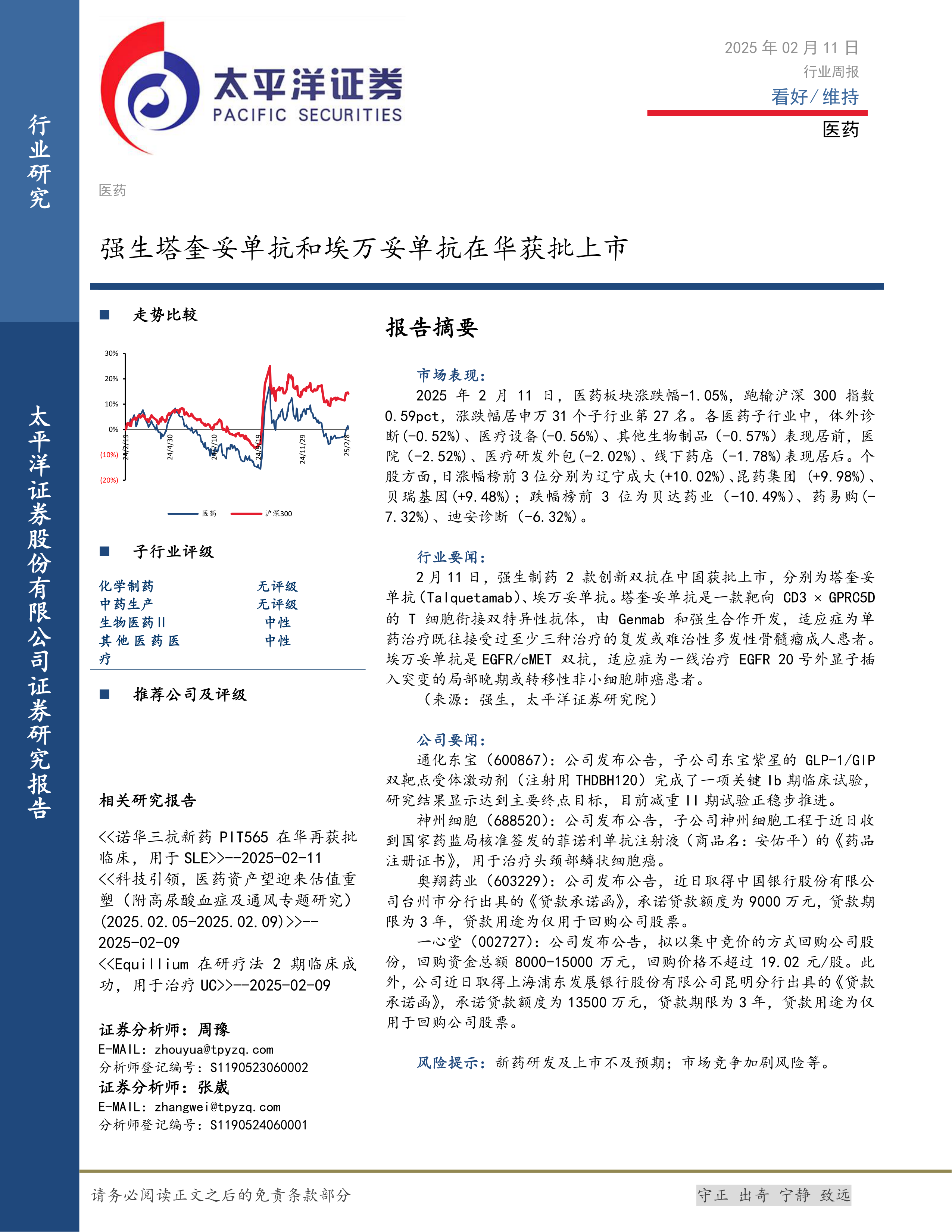 本报告的核心观点是:2025年2月11日,医药板块整体表现弱于大盘,但强生两款创新双抗药物在华获批上市是利好消息,部分公司也发布了积极的公告,例如通化东宝的GLP-1/GIP双靶点受体激动剂临床试验取得成功,神州细胞获得菲诺利单抗注射液的注册证书。 尽管市场表现整体偏弱,但部分细分领域和个股表现亮眼,未来发展仍存在机遇与挑战。