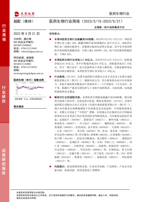 本报告对2023年5月15日至2023年5月21日医药生物行业进行了周度回顾和分析。数据显示,本周医药生物行业整体表现良好,跑赢沪深300指数,多数细分板块录得正收益,但估值仍处于相对低位。全国中成药集采的启动对行业的影响预计有限,中药板块有望受益。报告维持对医药生物行业的超配评级,并推荐关注中药、医美、医疗器械等板块的投资机会,同时提醒投资者注意潜在的风险因素。 报告中提供的投资建议仅供参考,投资者应根据自身情况进行独立判断,并承担相应的投资风险。