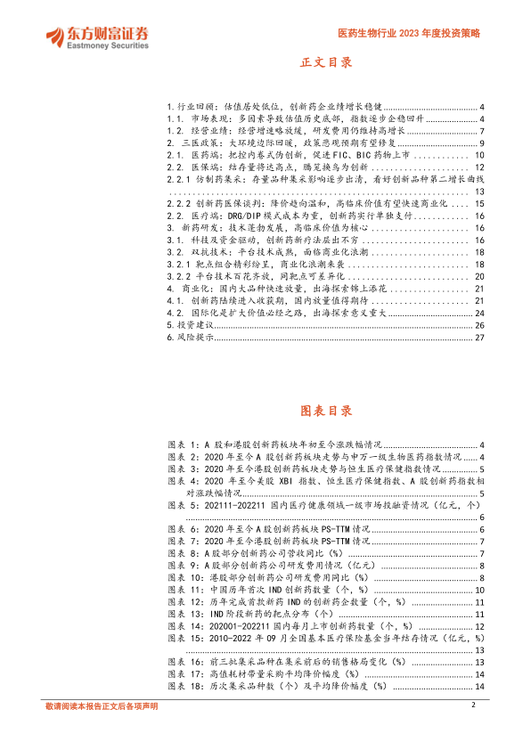 本报告的核心观点是:2022年A股和港股创新药行业整体表现疲软,但11月份以来有所反弹。 未来,随着三医联动改革的推进、政策边际回暖、创新药进入业绩兑现期以及国际化进程的加快,创新药行业有望迎来新的发展机遇。 投资建议关注平台技术扎实、临床进展确定性高且有出海预期的企业。