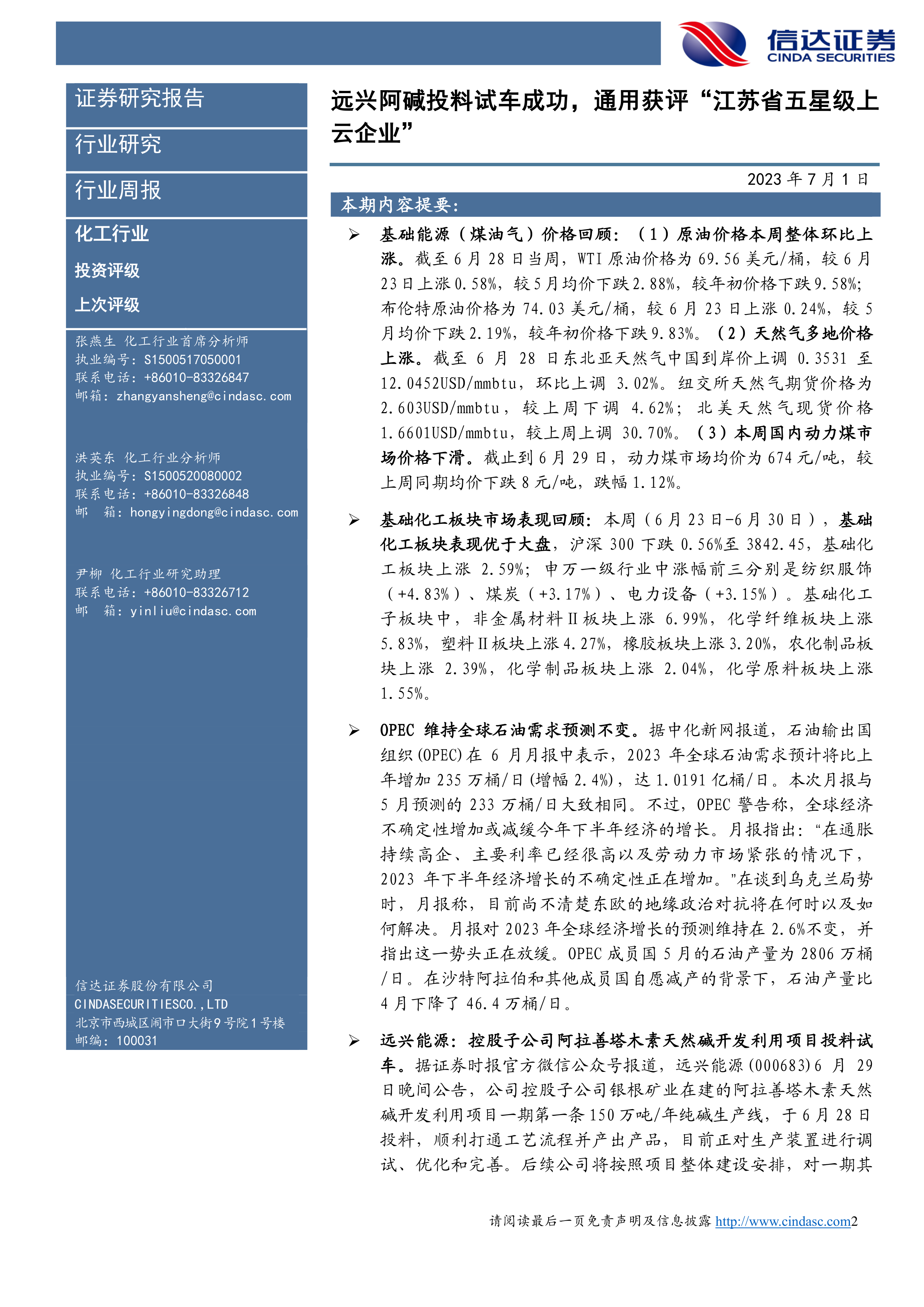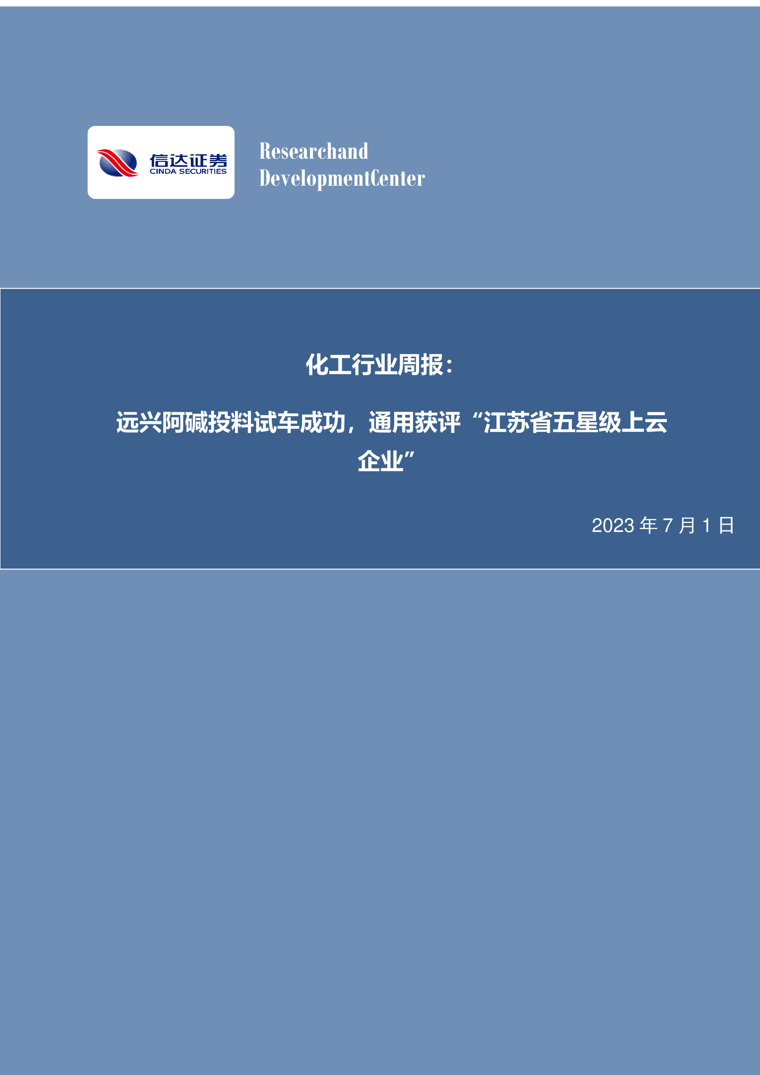 化工行业周报:远兴阿碱投料试车成功,通用获评“江苏省五星级上云企业”