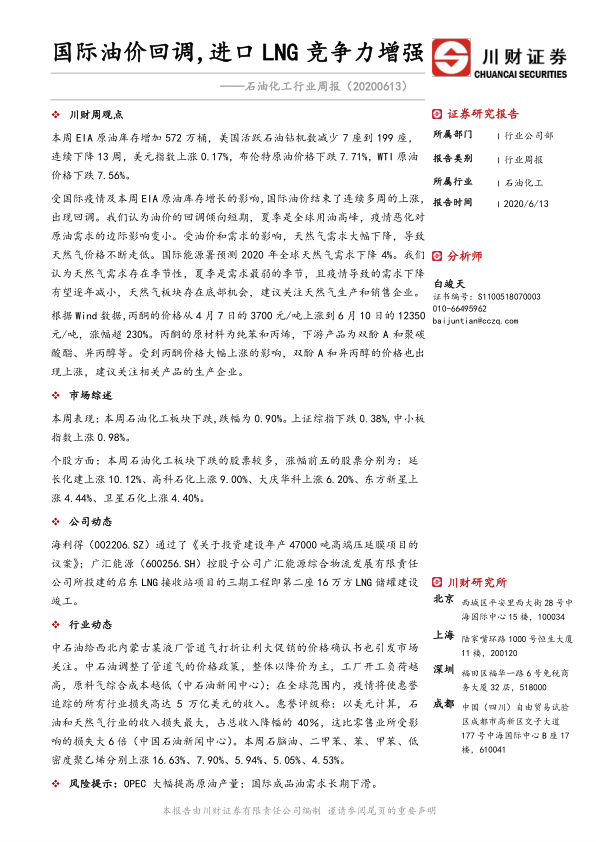 石油化工行业周报:国际油价回调,进口LNG竞争力增强