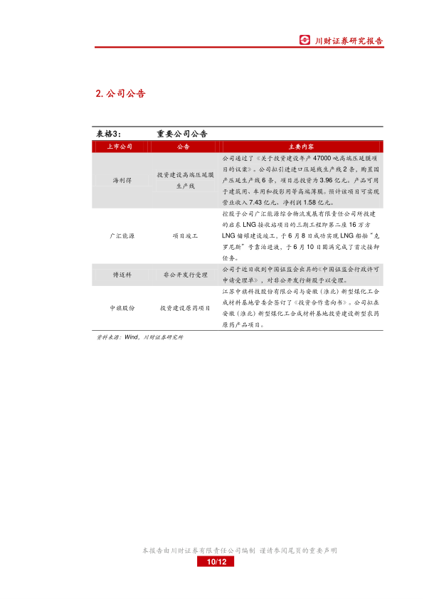 本周重要公司公告包括:海利得投资建设年产47000吨高端压延膜项目;广汇能源启东LNG接收站项目三期工程竣工;博迈科非公开发行新股获受理;中旗股份拟在安徽投资建设新型农药原药产品项目。
