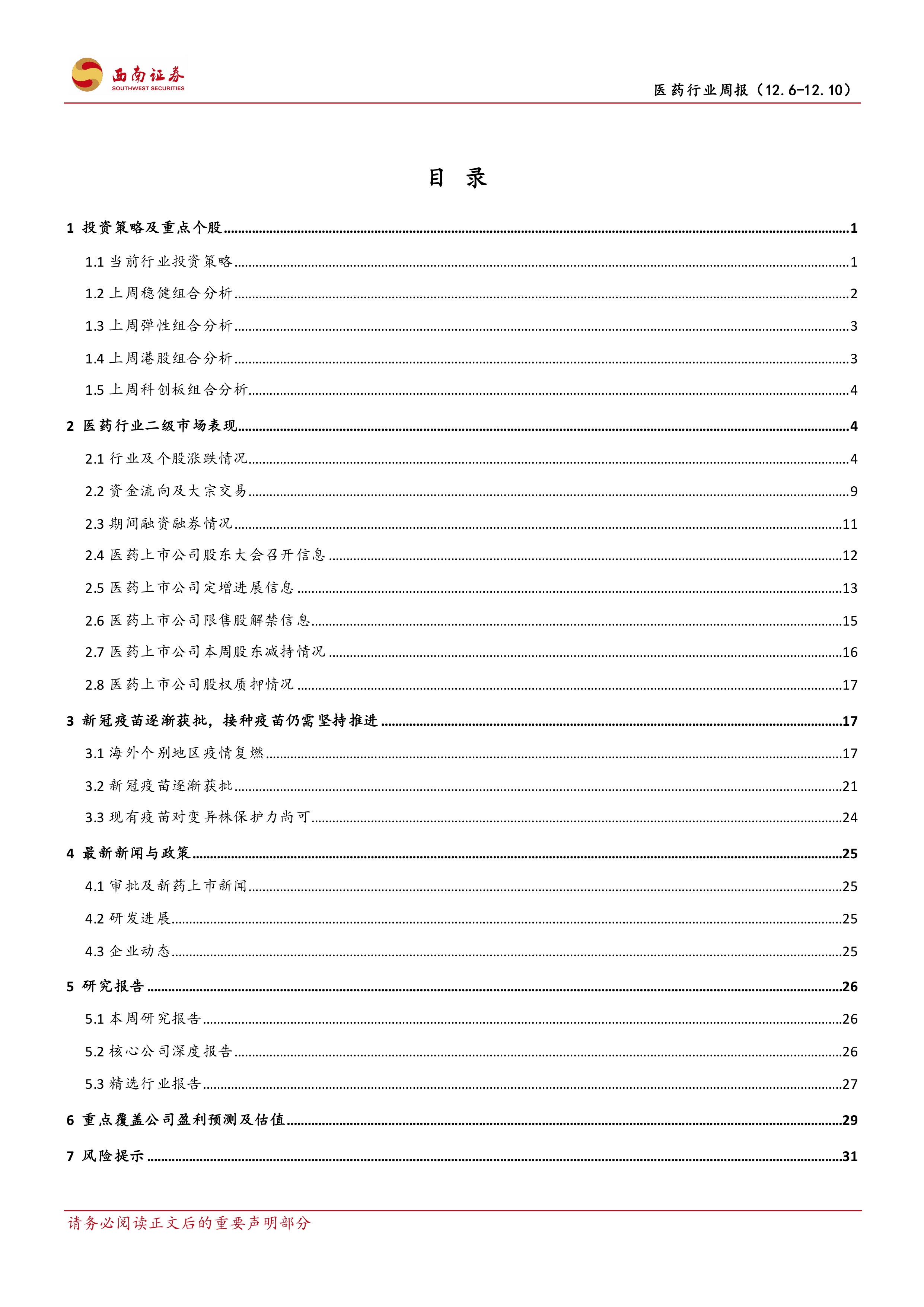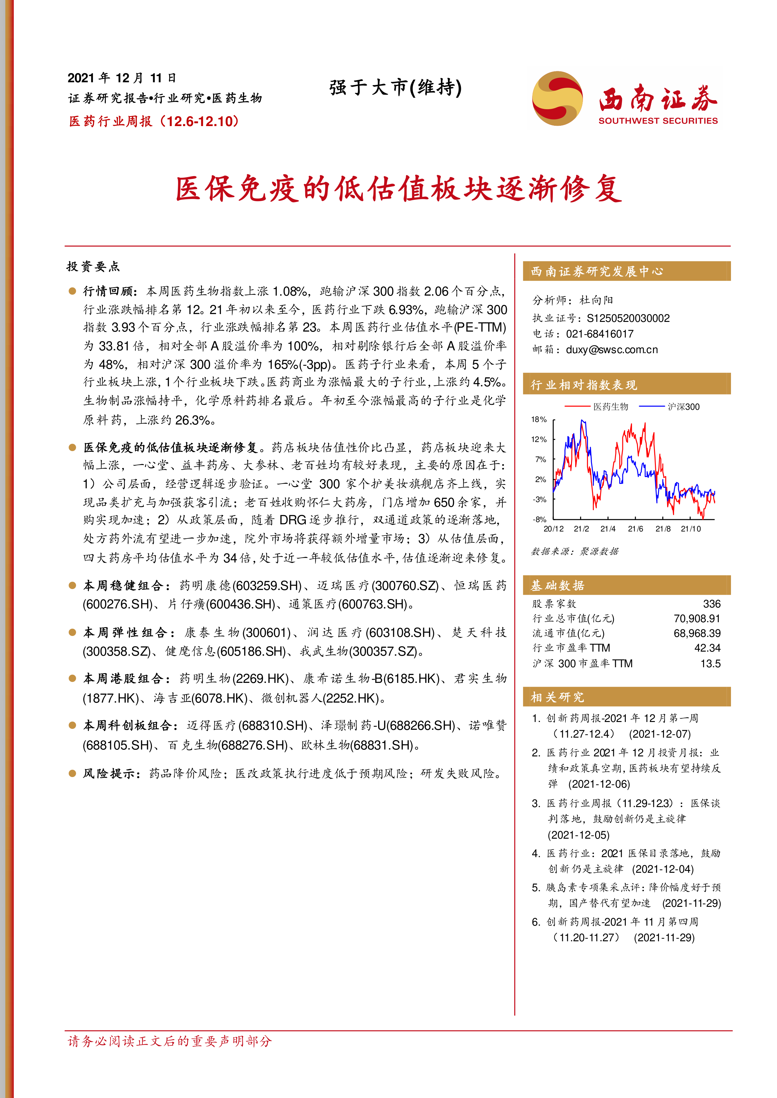 本报告对2021年12月6日至10日一周的医药行业进行了全面分析,涵盖了行业整体表现、重点子行业分析、投资组合策略、二级市场动态以及新冠疫苗进展等多个方面。报告指出,医药行业本周表现强于大市,但年初至今表现相对落后。药店板块由于公司经营、政策利好和估值修复等因素,表现突出,值得关注。报告提供的投资组合和个股分析,为投资者提供了参考信息,但投资者仍需根据自身情况进行独立判断。 报告也提示了药品降价、医改政策执行进度和研发失败等风险因素。