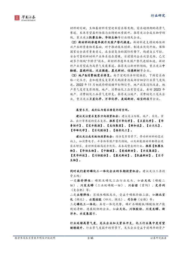 建议关注需求复苏方向投资机会:建议关注纺服、地产、农化、食品、出行等赛道的需求复苏。推荐【万华化学】、【卫星化学】、【华鲁恒升】、【宝丰能源】、【龙佰集团】、【新和成】、【云天化】、【华峰化学】、【巨化股份】、【扬农化工】。