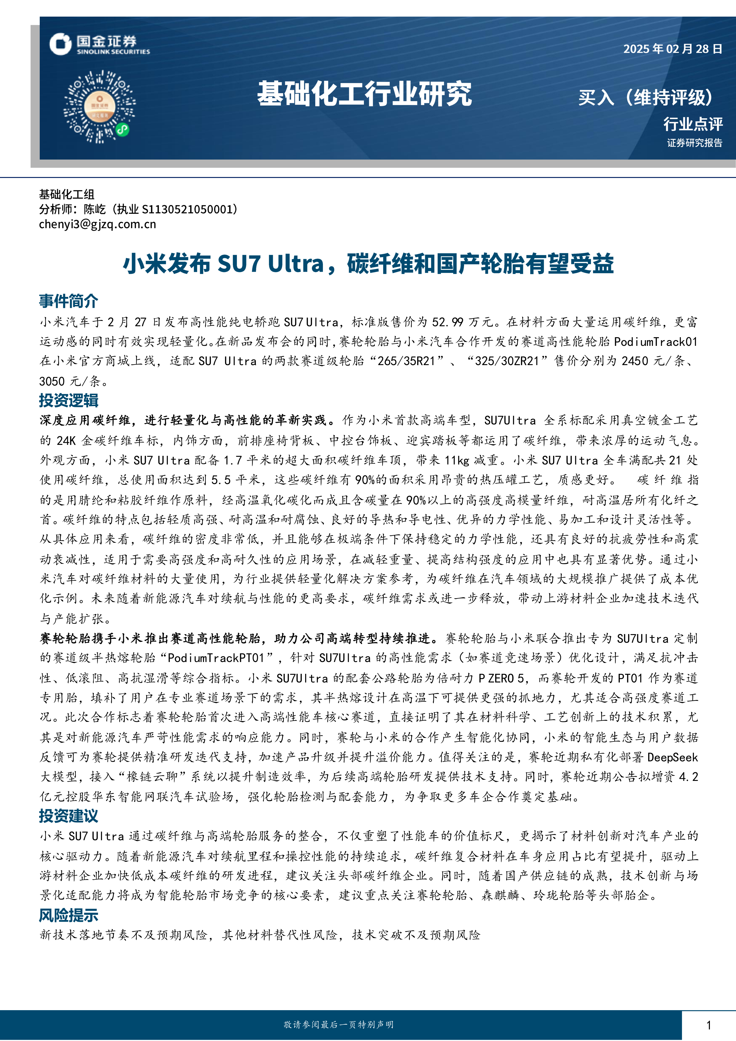 基础化工行业研究:小米发布SU7 Ultra,碳纤维和国产轮胎有望受益