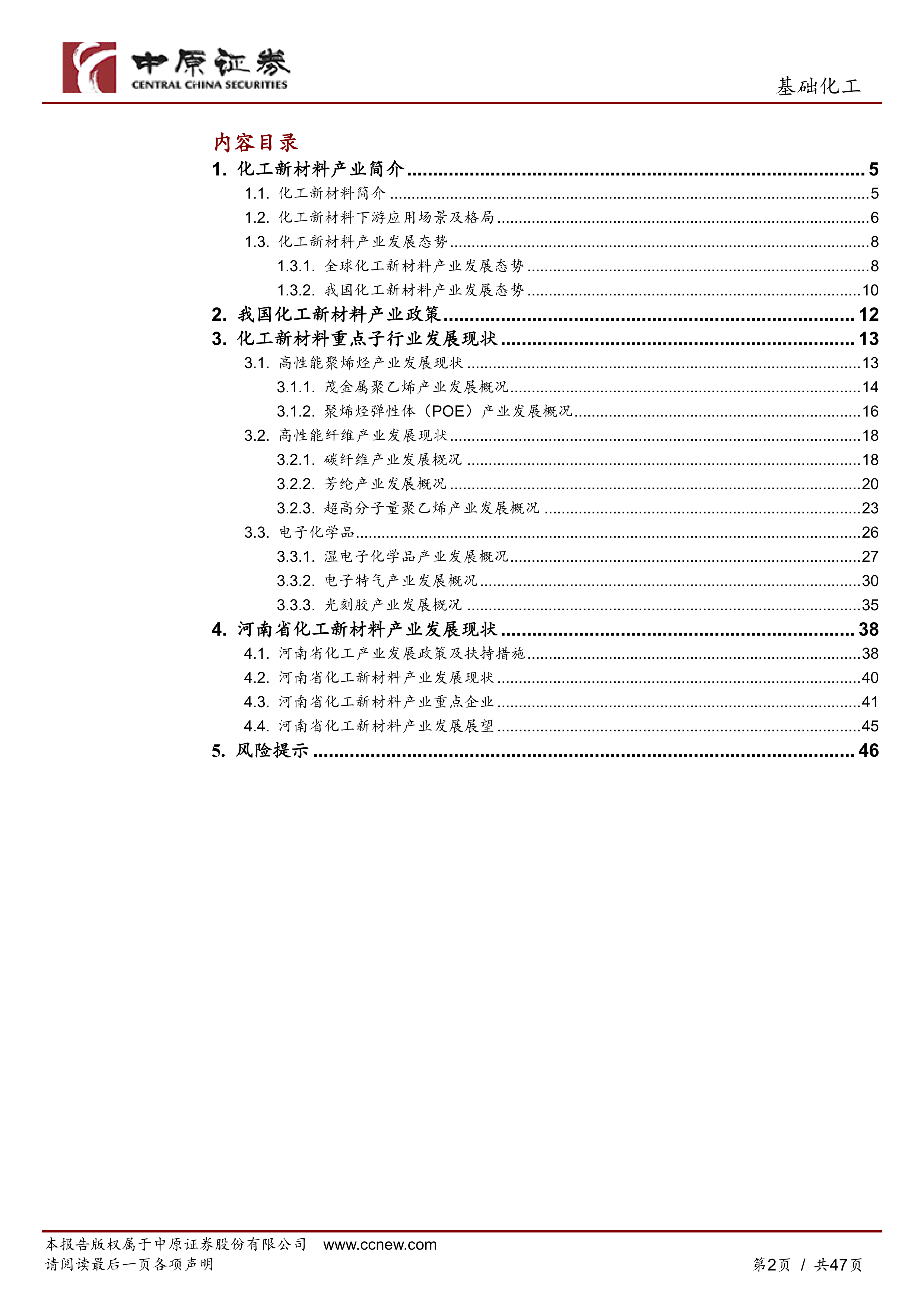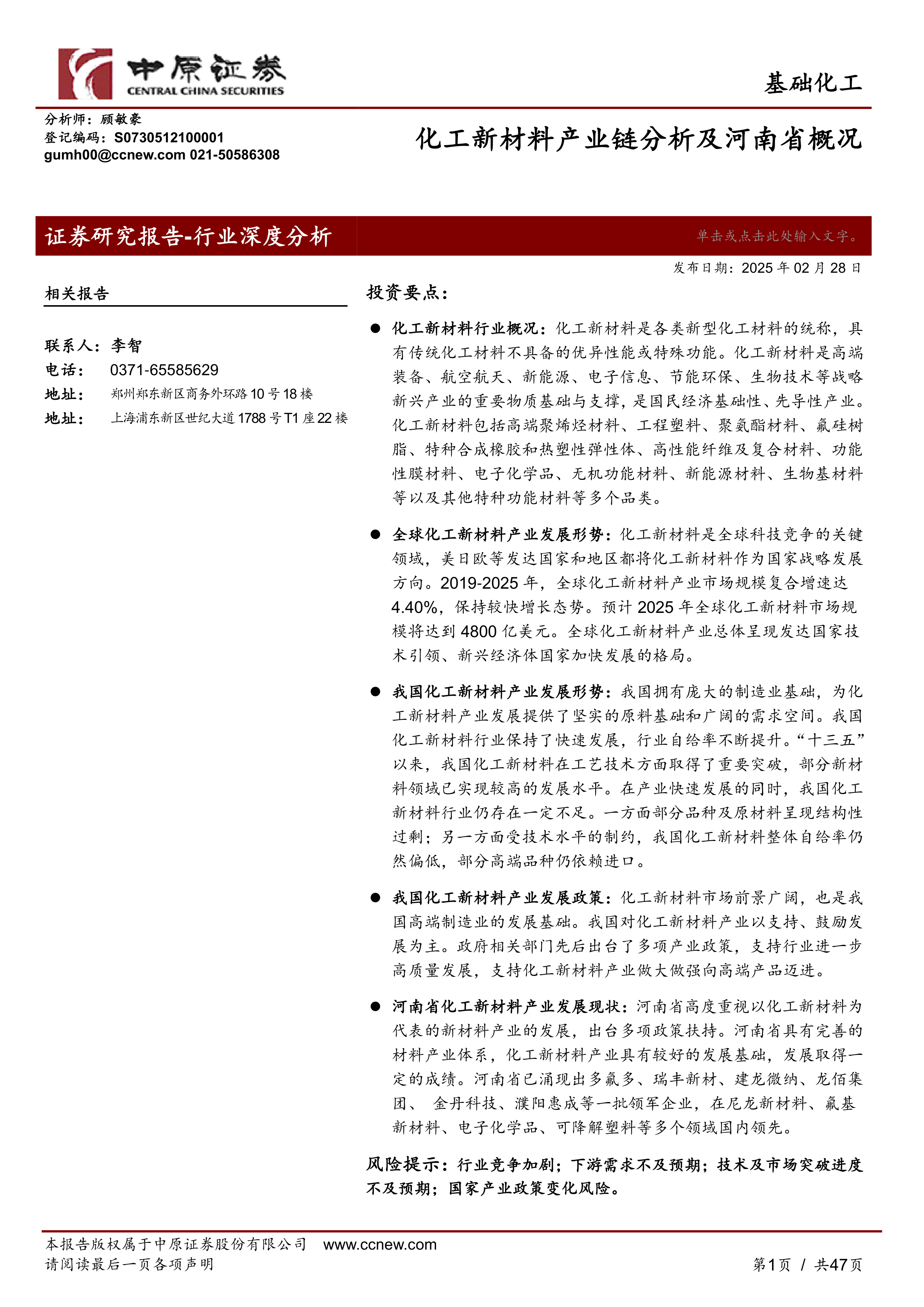 本报告对全球及中国化工新材料产业进行了全面分析,指出化工新材料产业市场前景广阔,但我国产业发展仍面临诸多挑战。河南省作为重要的化工产业基地,拥有发展化工新材料产业的良好基础,但需进一步优化产业布局、提升技术创新能力,才能抓住机遇,实现高质量发展。报告最后列出了行业投资评级和公司投资评级,并包含了证券分析师承诺和重要声明。