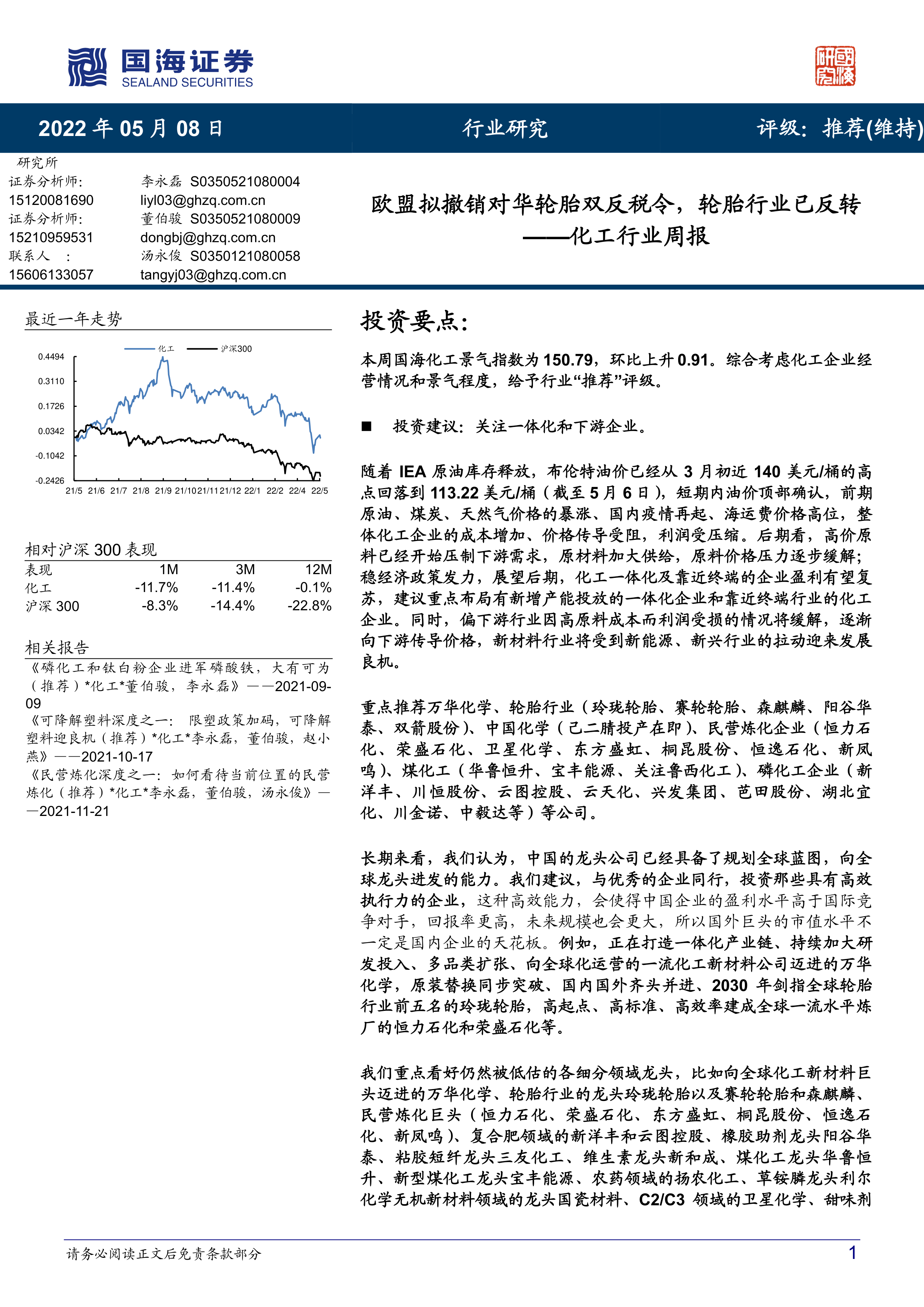 本报告的核心观点是:欧盟拟撤销对华轮胎双反税令,为轮胎行业带来利好,化工行业整体景气度回升,建议关注一体化和下游企业,重点布局有新增产能投放的一体化企业和靠近终端行业的化工企业,以及仍然被低估的各细分领域龙头企业。