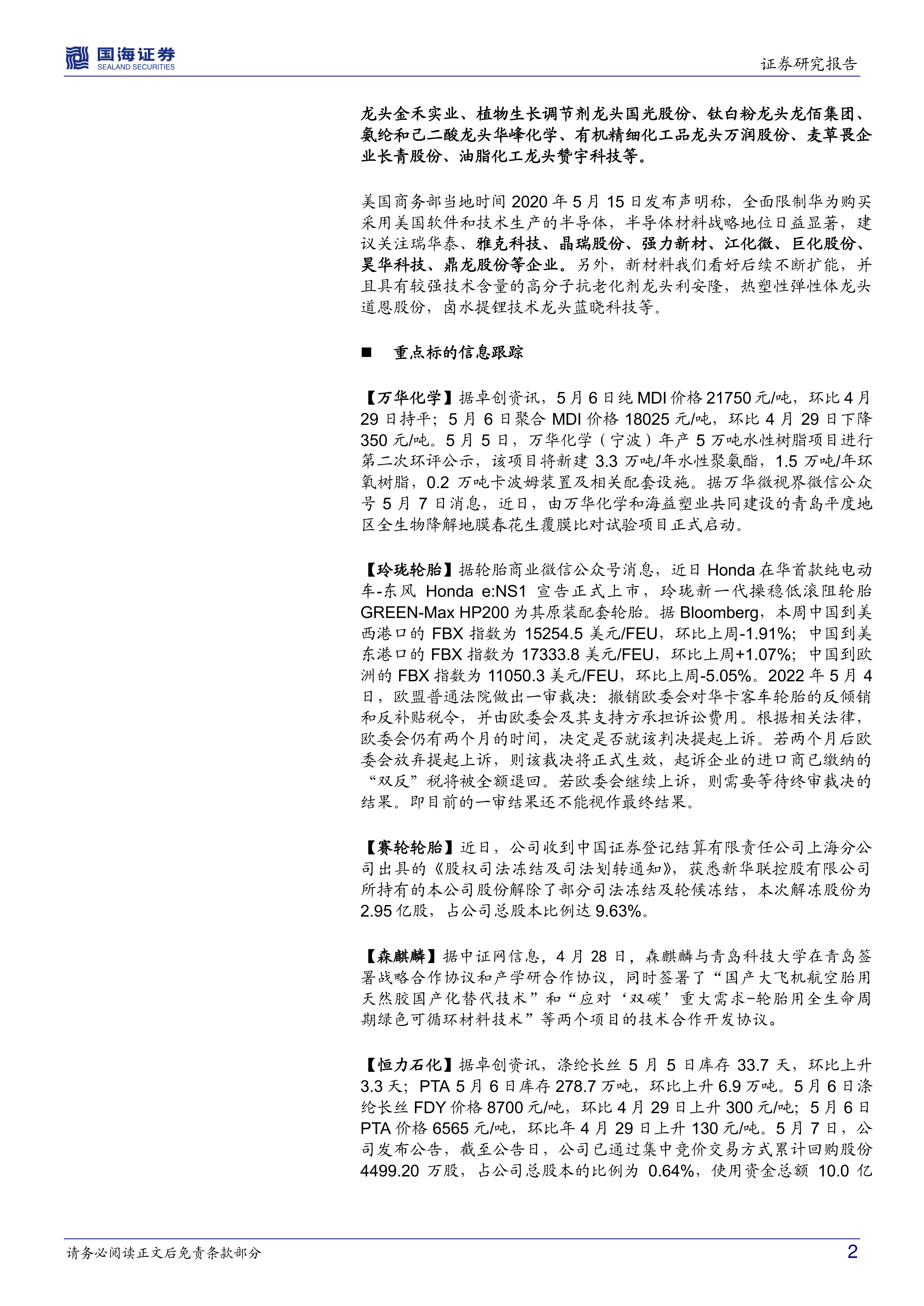 【万华化学】据卓创资讯,5月6日纯MDI价格21750元/吨,环比4月29日持平;5月6日聚合MDI价格18025元/吨,环比4月29日下降350元/吨。5月5日,万华化学(宁波)年产5万吨水性树脂项目进行第二次环评公示,该项目将新建3.3万吨/年水性聚氨酯,1.5万吨/年环氧树脂,0.2万吨卡波姆装置及相关配套设施。据万华微视界微信公众号5月7日消息,近日,由万华化学和海益塑业共同建设的青岛平度地区全生物降解地膜春花生覆膜比对试验项目正式启动。
