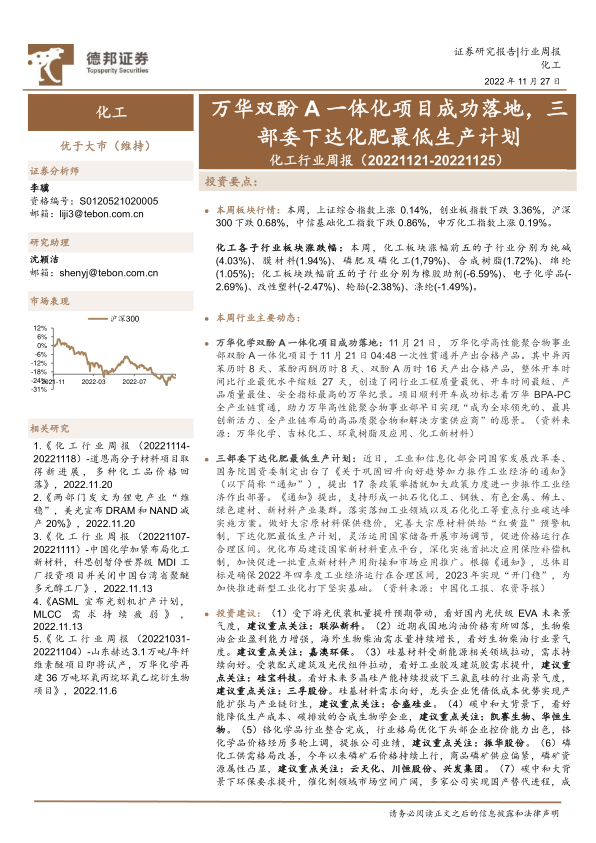 化工行业周报:万华双酚A一体化项目成功落地,三部委下达化肥最低生产计划