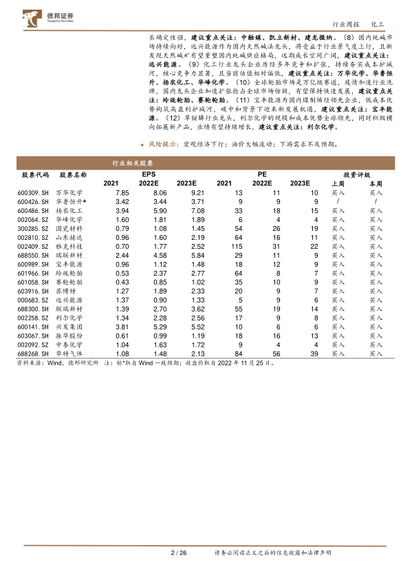 投资建议:(1)受下游光伏装机量提升预期带动,看好国内光伏级EVA未来景气度,建议重点关注:联泓新科。(2)近期我国地沟油价格有所回落,生物柴油企业盈利能力增强,海外生物柴油需求量持续增长,看好生物柴油行业景气度。建议重点关注:嘉澳环保。(3)硅基材料受新能源相关领域拉动,需求持续向好。受装配式建筑及光伏组件拉动,看好工业胶及建筑胶需求提升,建议重点关注:硅宝科技。看好未来多晶硅产能持续投放下三氯氢硅的行业高景气度,建议重点关注:三孚股份。硅基材料需求向好,龙头企业凭借低成本优势实现产能扩张与产业链衍生,建议重点关注:合盛硅业。(4)碳中和大背景下,看好能降低生产成本、碳排放的合成生物学企业,建议重点关注:凯赛生物、华恒生物。(5)铬化学品行业整合完成,行业格局优化下头部企业控价能力出色,铬化学品价格经历多轮上调,提振公司业绩,建议重点关注:振华股份。(6)磷化工供需格局改善,今年以来磷矿石价格持续上行,商品磷矿供应偏紧,磷矿资源属性凸显,建议重点关注:云天化、川恒股份、兴发集团。(7)碳中和大背景下环保要求提升,催化剂领域市场空间广阔,多家公司实现国产替代进程,成长确定性强,建议重点关注:中触媒、凯立新材、建龙微纳。(8)国内纯碱市场持续向好,远兴能源作为国内天然碱法龙头,将受益于行业景气度上行,且新发现天然碱矿有望重塑国内纯碱供应格局,远期成长空间广阔,建议重点关注:远兴能源。(9)化工行业龙头企业历经多年竞争和扩张,持续夯实成本护城河,核心竞争力显著,且当前估值相对偏低,建议重点关注:万华化学、华鲁恒升、扬农化工、华峰化学。(10)全球轮胎市场是万亿级赛道,疫情加速行业洗牌,国内龙头企业加速扩张抢占全球市场份额,有望保持快速发展,建议重点关注:玲珑轮胎、赛轮轮胎。(11)宝丰能源为国内煤制烯烃领先企业,低成本优势构筑高盈利护城河,碳中和背景下迎来新发展机遇,建议重点关注:宝丰能源。(12)草铵膦行业龙头,利尔化学的规模和成本优势全球领先,同时积极横向拓展新产品,业绩有望持续增长,建议重点关注:利尔化学。