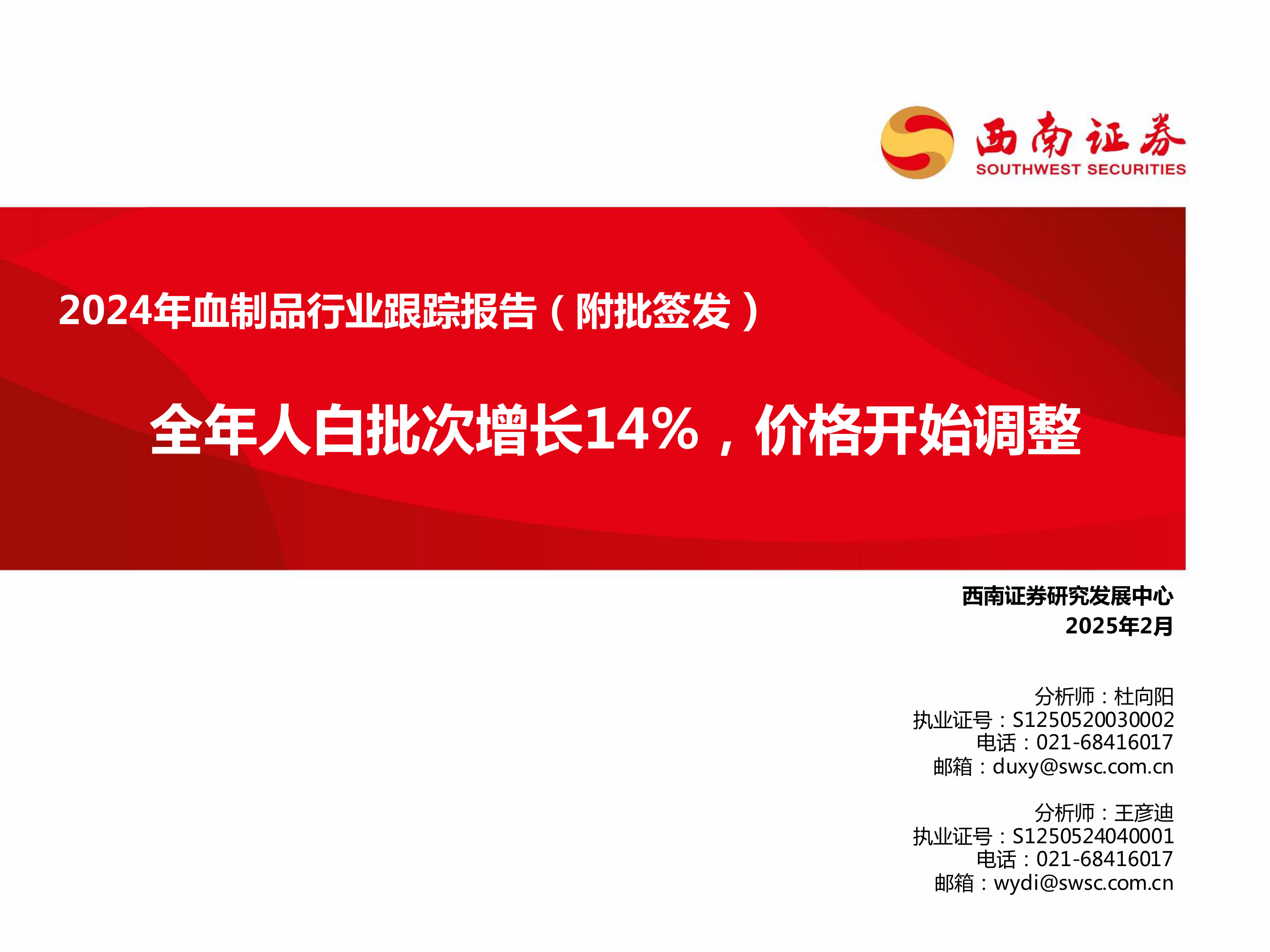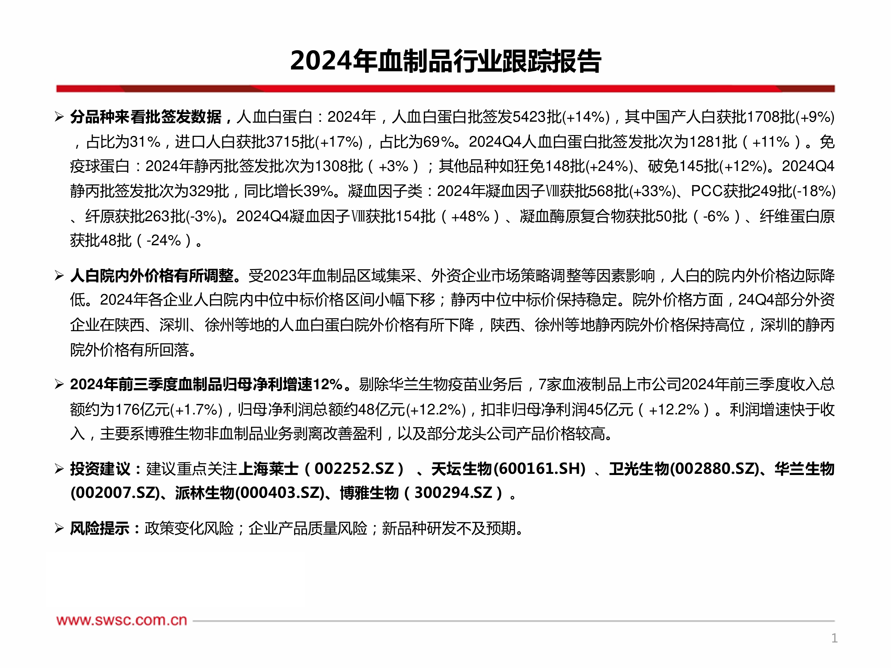 2024年血制品行业跟踪报告(附批签发):全年人白批次增长14%,价格开始调整