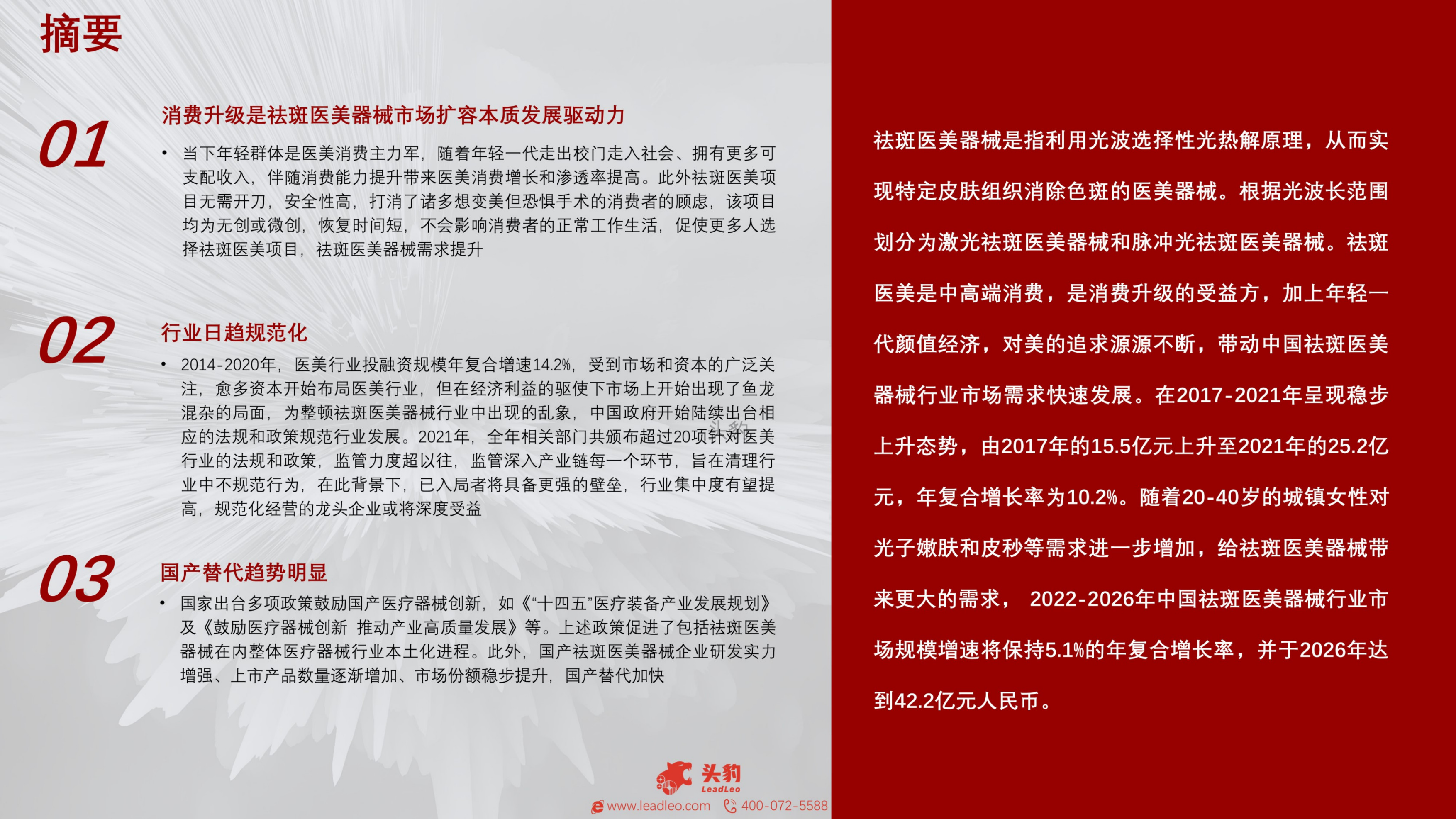 当下年轻群体是医美消费主力军,随着年轻一代走出校门走入社会、拥有更多可支配收入,伴随消费能力提升带来医美消费增长和渗透率提高。此外祛斑医美项日无需开刀,安全性高,打消了诸多想变美但恐惧手术的消费者的顾虑,该项目均为无创或微创,恢复时间短,不会影响消费者的正常工作生活,促使更多人选择祛斑医美项目,祛斑医美器械需求提升