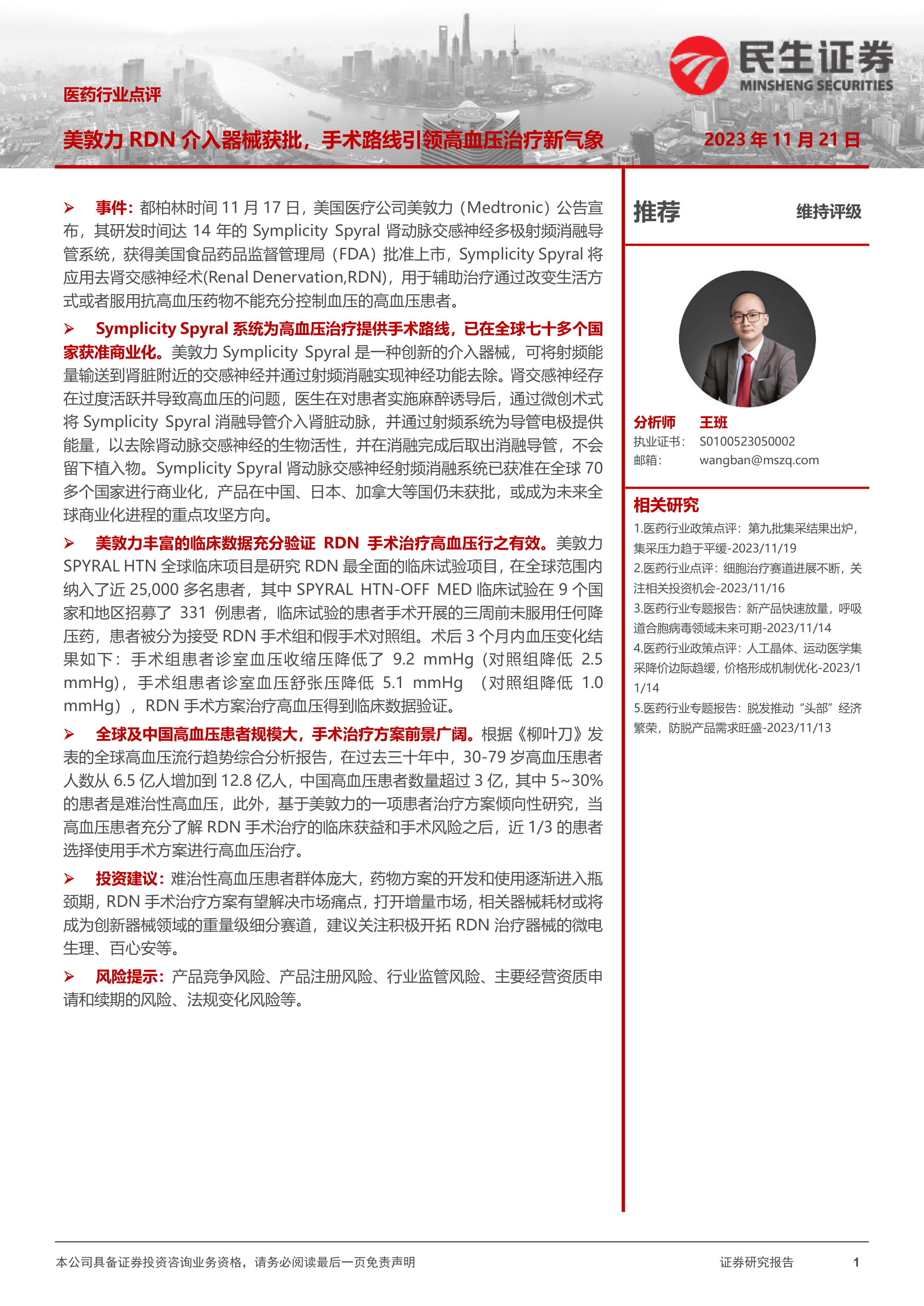 医药行业点评:美敦力RDN介入器械获批,手术路线引领高血压治疗新气象