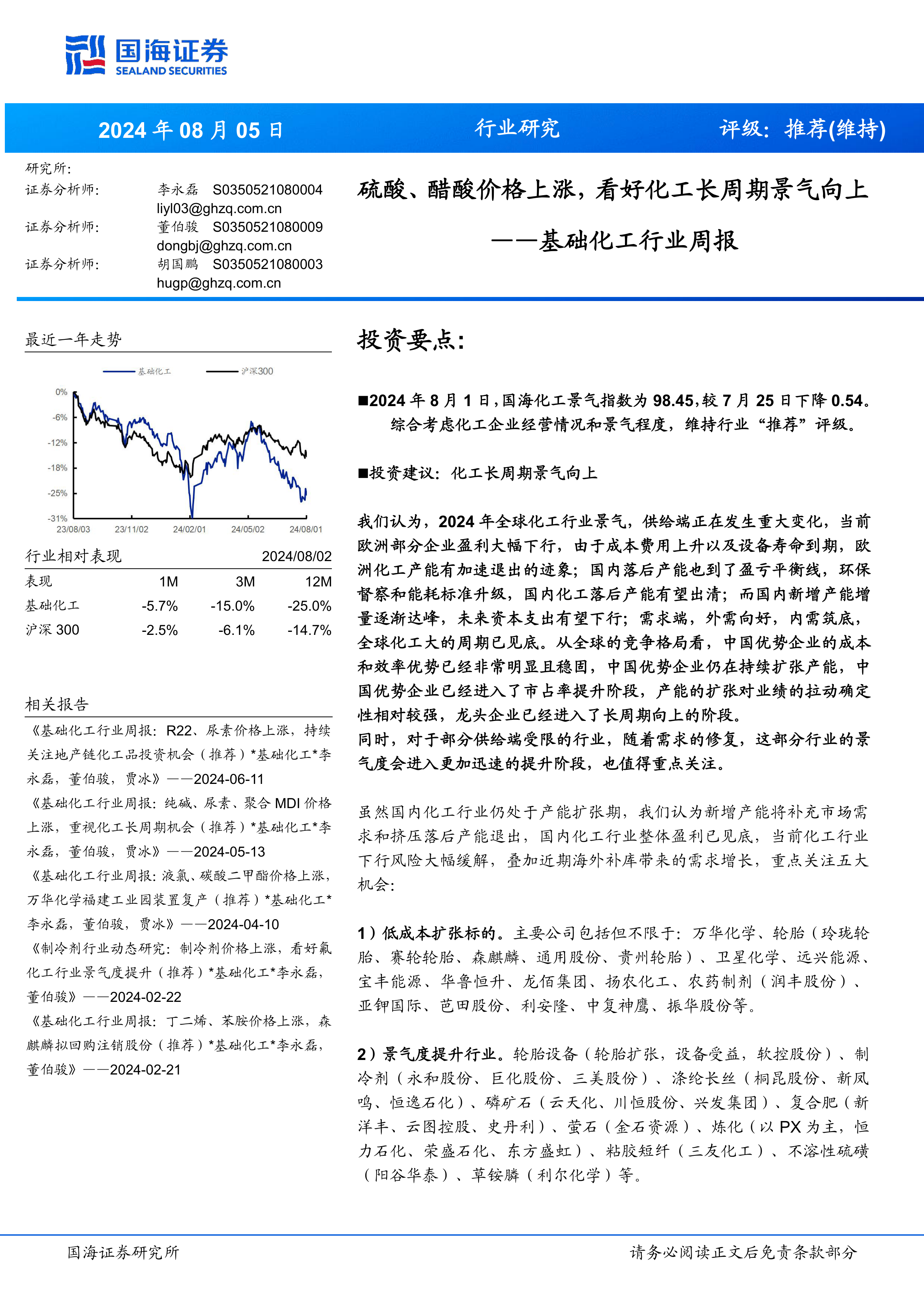 报告首先指出2024年8月1日国海化工景气指数为98.45,较7月25日下降0.54,但综合考虑化工企业经营情况和景气程度,维持行业“推荐”评级。 并对比了基础化工行业与沪深300指数最近一年(1M, 3M, 12M)的表现,基础化工行业表现落后于沪深300指数。
