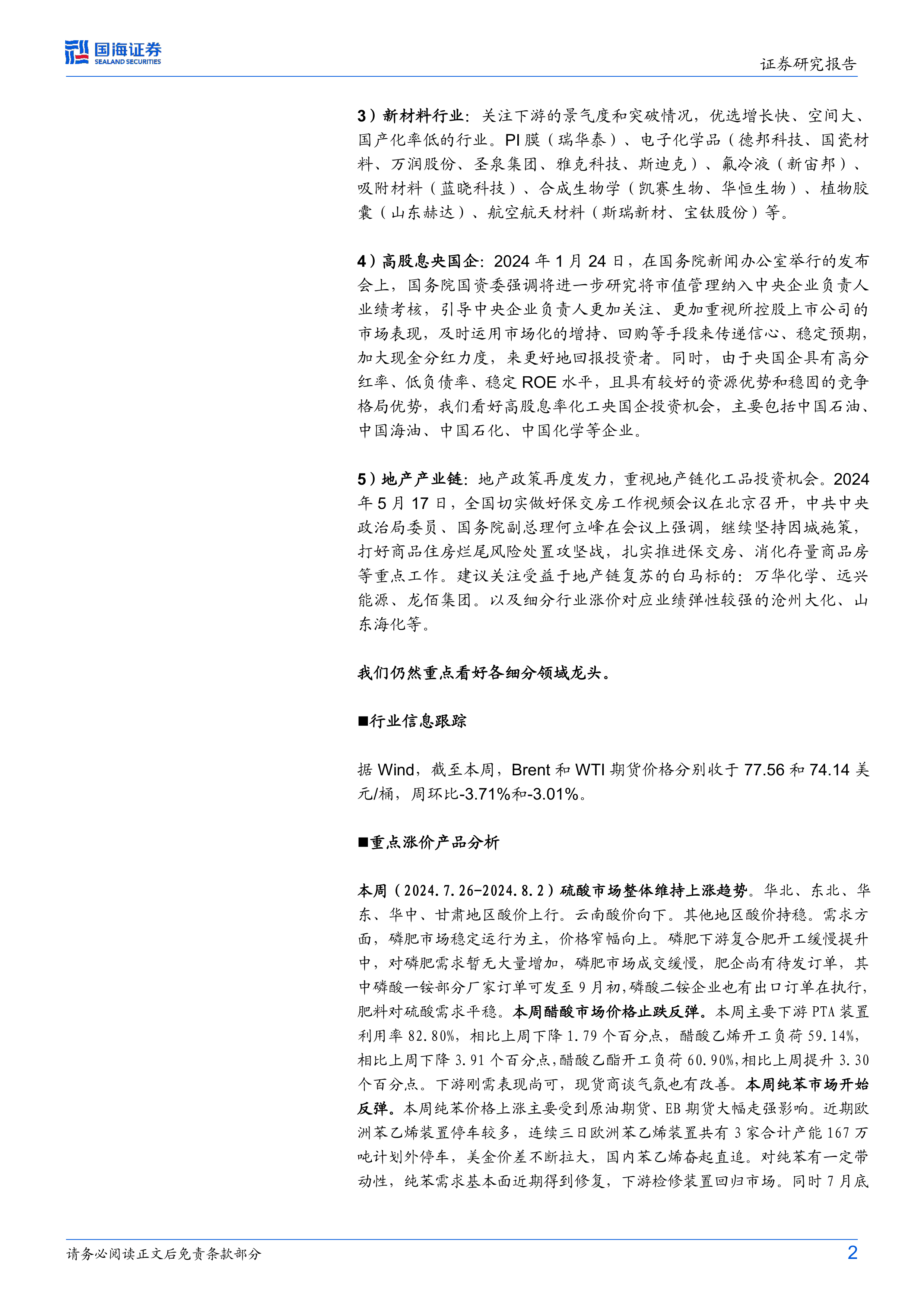 报告跟踪了Brent和WTI原油期货价格的周环比变化,并分析了硫酸、醋酸、纯苯等重点涨价产品的市场行情,包括价格波动、下游需求以及相关企业开工率等信息。
