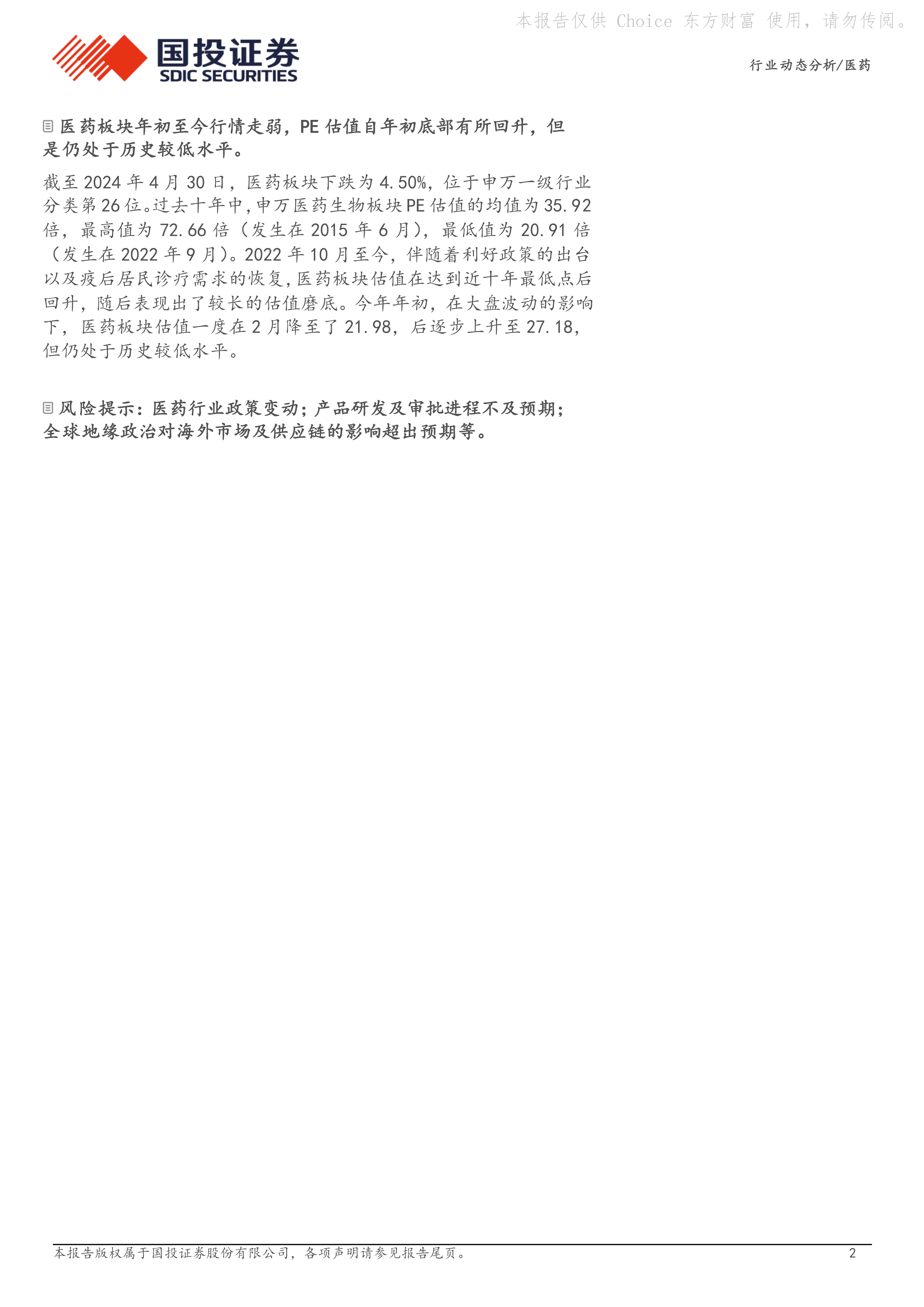 本部分分析了2024年第一季度医药板块的运行情况。数据显示,截至2024年4月30日,医药板块下跌4.50%,位于申万一级行业分类第26位。板块PE估值自年初底部有所回升,但仍处于历史较低水平(27.18倍),远低于过去十年的平均值(35.92倍)。