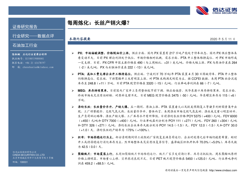 本报告基于信达证券的研究,利用图表数据对2020年5月11日一周的中国石化行业市场进行了分析。报告显示,涤纶长丝市场表现突出,量价齐升,产销火爆;而其他石化产品市场则呈现出较为分化的态势,部分产品库存累积,需求端复苏乏力。 投资者需关注宏观经济形势、油价波动以及产业链产能变化等因素对石化行业的影响,并谨慎进行投资决策。 报告中提供的图表数据为投资者提供了重要的参考信息,但投资者仍需进行独立的判断和分析。 本报告不构成任何投资建议。