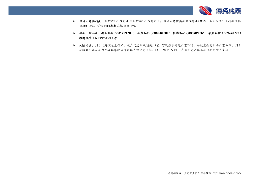 自2017年9月4日至2020年5月8日,信达大炼化指数涨幅为45.86%,石油加工行业指数涨幅为-33.03%,沪深300指数涨幅为3.07%。