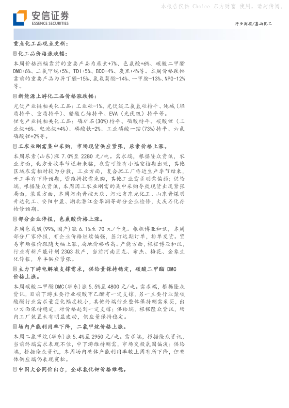 报告详细分析了尿素、色氨酸、碳酸二甲酯DMC等产品的价格波动,并从供给端和需求端两个方面进行了深入解读。例如,尿素价格上涨主要源于工农业刚需集中采购导致的现货供应紧张;色氨酸价格上涨则与部分企业停报和远期订单签订有关;碳酸二甲酯DMC价格上涨则得益于下游电解液需求的支撑。