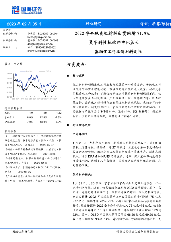 基础化工行业新材料周报:2022年全球负极材料出货同增71.9%,昊华科技拟收购中化蓝天