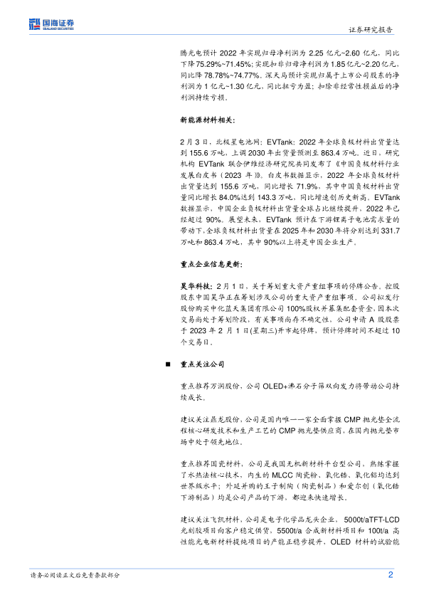 本报告的核心观点是:化工新材料领域是化工行业未来发展的重要方向,传统化工行业面临下游需求增速放缓和龙头企业市占率提升的挑战,而新材料领域则因研发能力、产业链验证门槛和服务能力等竞争壁垒而保持快速增长。 报告维持对化工新材料行业的“推荐”评级,并推荐了几家处于核心供应链、研发能力强、管理优异的优质标的,涵盖电子化学品(半导体材料、显示材料、5G材料等)、新能源材料等领域。 报告同时分析了2022年全球负极材料市场快速增长的情况,并对部分重点公司进行了信息更新和盈利预测。