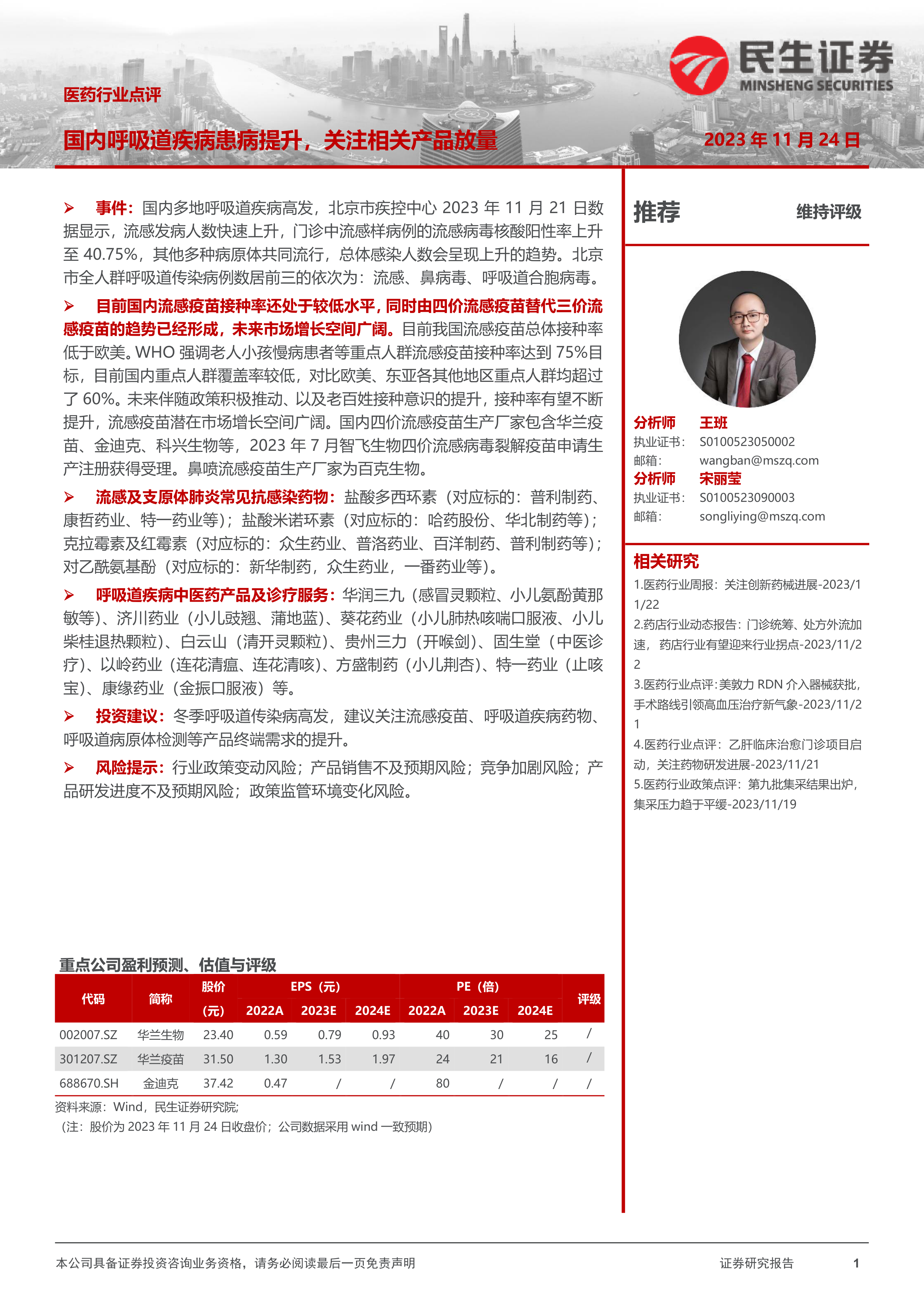 报告建议关注流感疫苗、呼吸道疾病药物、呼吸道病原体检测等产品终端需求的提升。 同时,也明确指出投资风险,包括:行业政策变动风险;产品销售不及预期风险;竞争加剧风险;产品研发进度不及预期风险;政策监管环境变化风险。