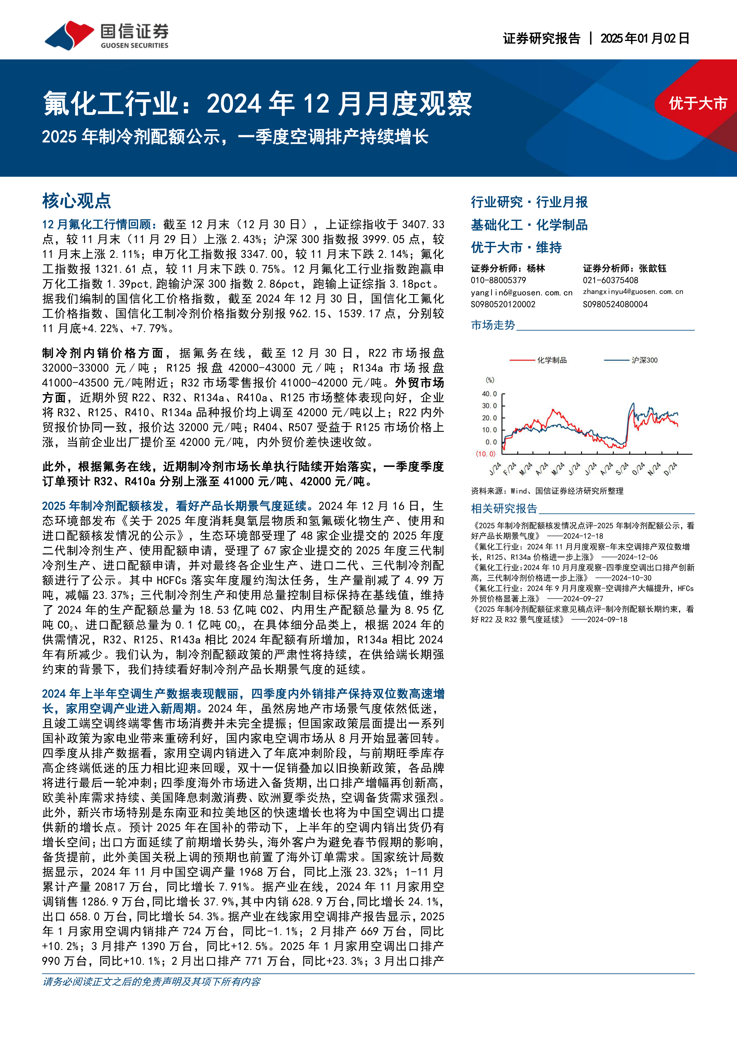氟化工行业:2024年12月月度观察:2025年制冷剂配额公示,一季度空调排产持续增长