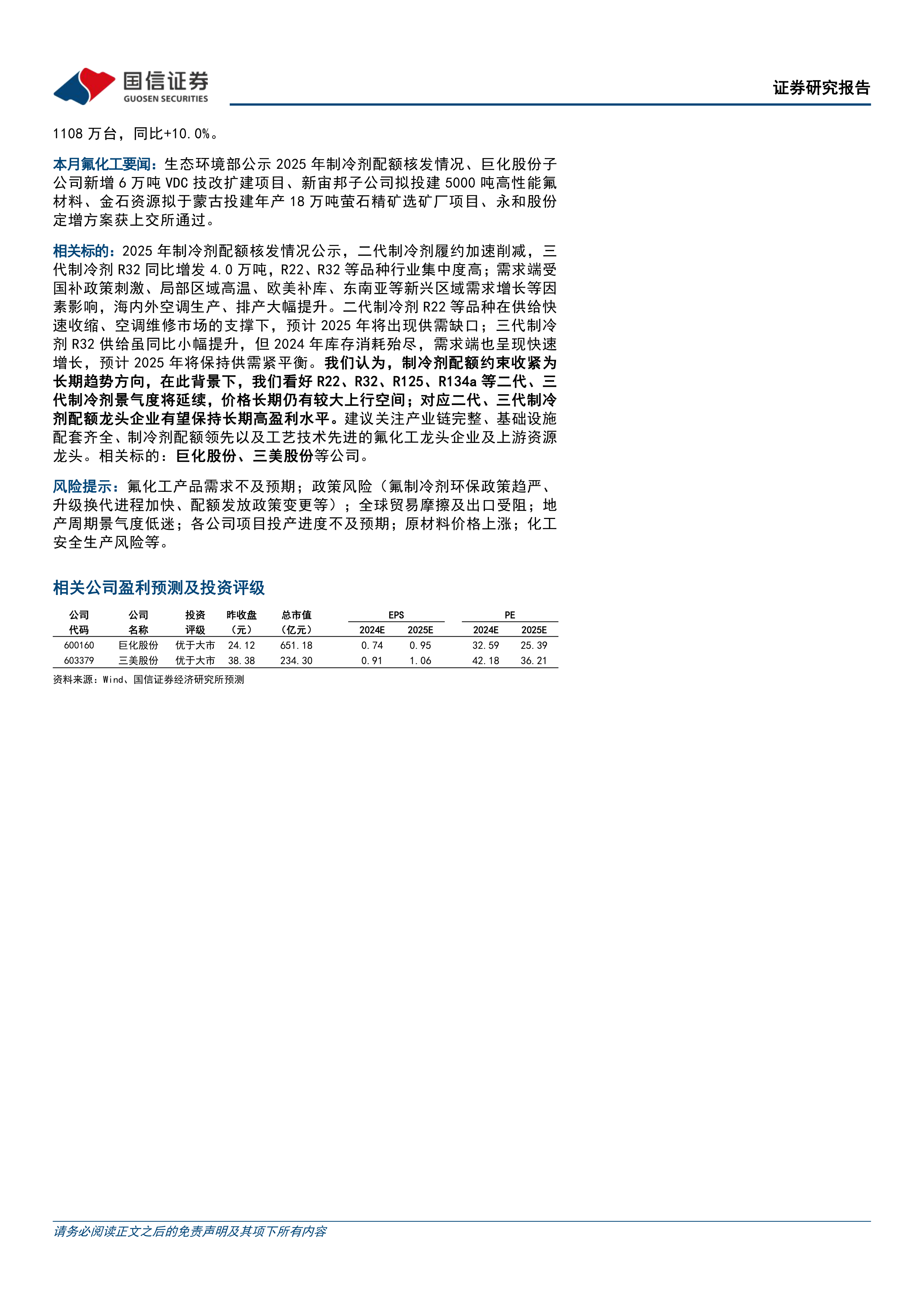 报告最后给出了国信化工的投资观点和盈利预测,并列出了相关的风险提示。 报告看好R22、R32、R125、R134a等制冷剂的长期景气度,并建议关注产业链完整、基础设施配套齐全、制冷剂配额领先以及工艺技术先进的氟化工龙头企业,例如巨化股份和三美股份。 同时,报告也指出了氟化工行业面临的需求不及预期、政策风险、贸易摩擦、地产周期低迷等风险。