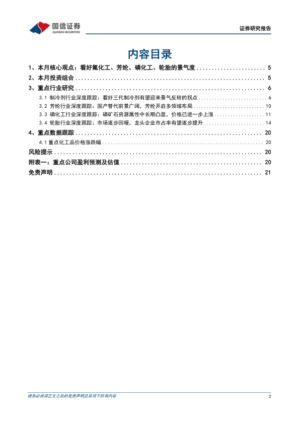 报告对制冷剂、芳纶、磷化工和轮胎四个重点行业进行了深度跟踪分析: