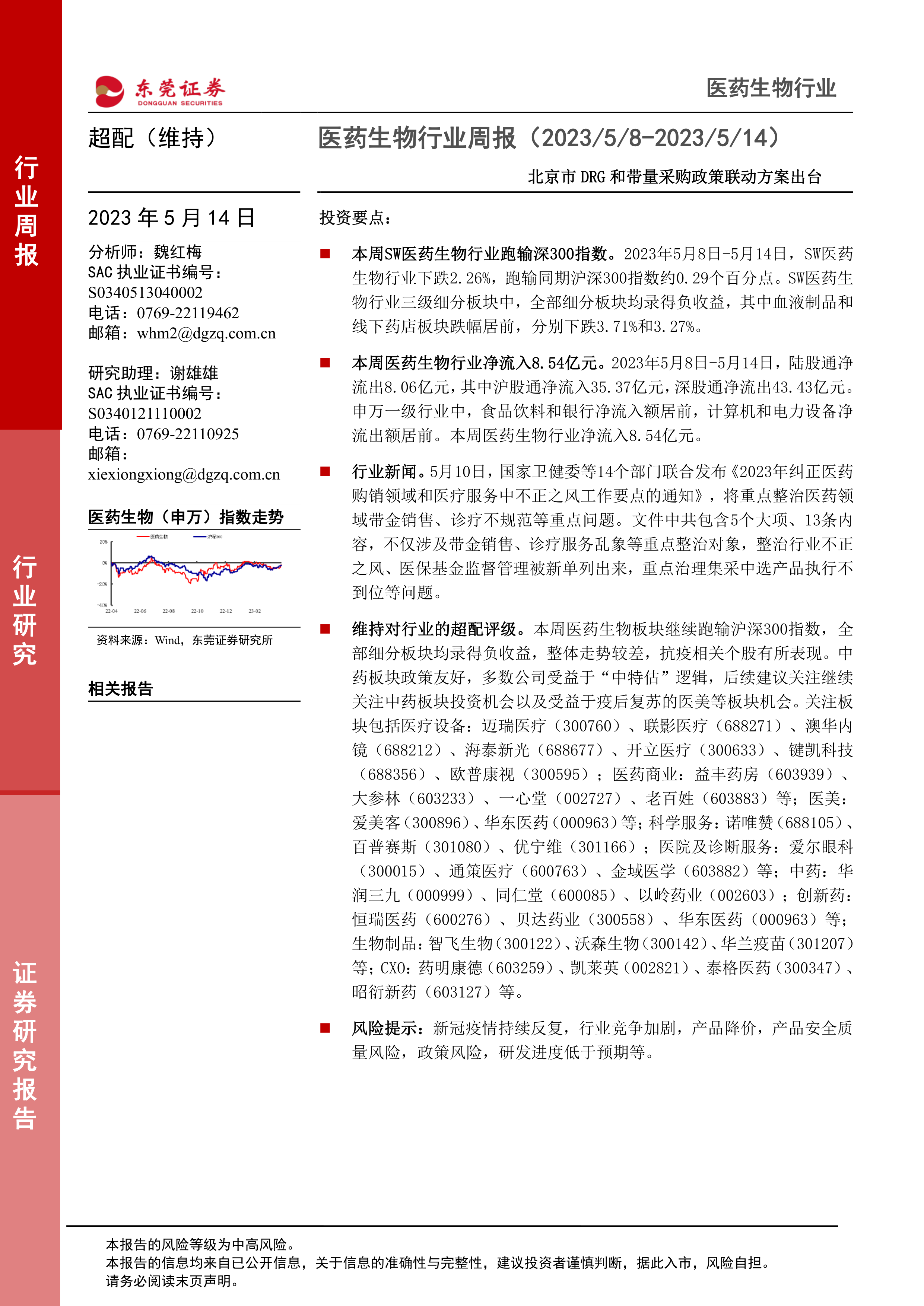 本报告对2023年5月8日至14日SW医药生物行业进行了周度回顾和分析。行业整体表现疲软,跑输沪深300指数,所有细分板块均录得负收益,但个股表现分化明显。行业面临政策监管加强和估值下降的挑战,但中药板块和疫后复苏板块仍存在投资机会。报告维持对行业的超配评级,并推荐了一系列值得关注的个股,同时提示了多种潜在的投资风险。投资者应谨慎判断,据此入市,风险自担。