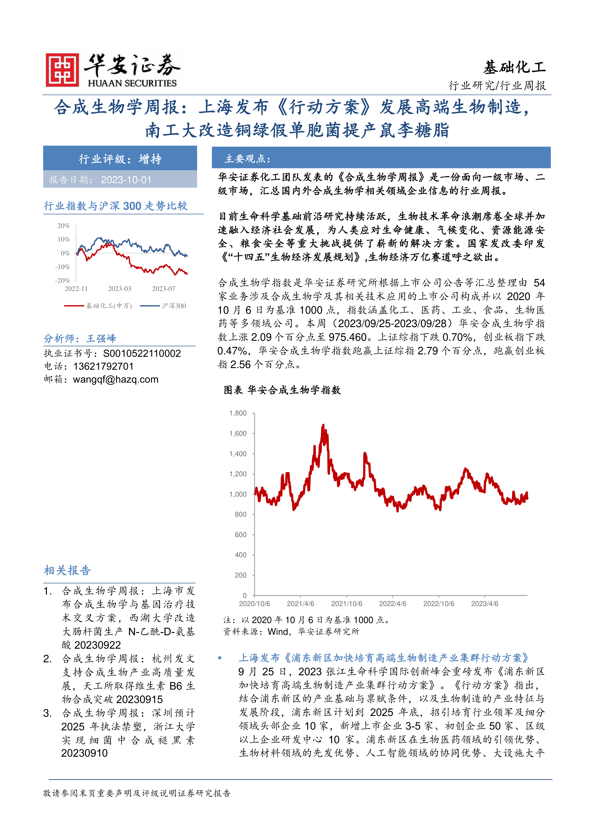 目前,生命科学基础前沿研究持续活跃,生物技术革命浪潮席卷全球,为解决人类面临的重大挑战提供了新的解决方案。国家政策的支持,例如《“十四五”生物经济发展规划》,也为合成生物学行业发展提供了强劲的动力。华安证券研究所构建的合成生物学指数显示,本周(2023年9月25日至28日)该指数上涨2.09%,跑赢上证综指和创业板指,表明行业整体表现良好。