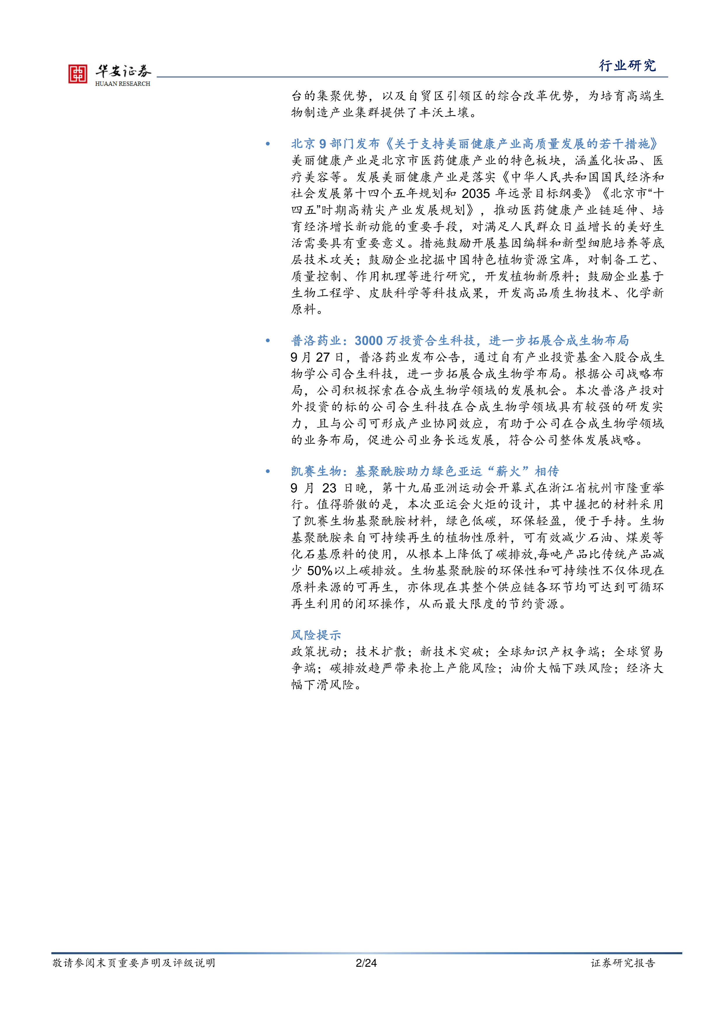 报告跟踪了国内外多家合成生物学公司的业务进展,包括凯赛生物的生物基聚酰胺应用、普洛药业的投资布局、Amyris的酵母细胞联产技术以及巴斯夫的生物基新产品等,展现了行业在不同领域的创新和发展。