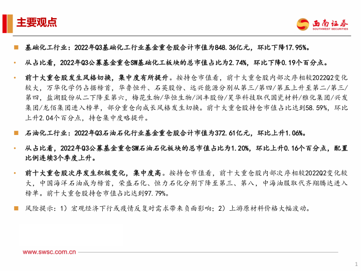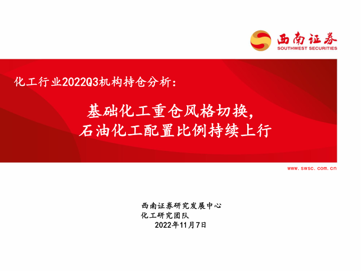 本报告基于西南证券研究发展中心化工研究团队于2022年11月7日发布的《化工行业2022Q3机构持仓分析:基础化工重仓风格切换,石油化工配置比例持续上行》报告,利用Wind数据库中的公募基金持仓数据,对2022年第三季度化工行业(基础化工和石油化工)的基金重仓情况进行分析。核心观点如下: