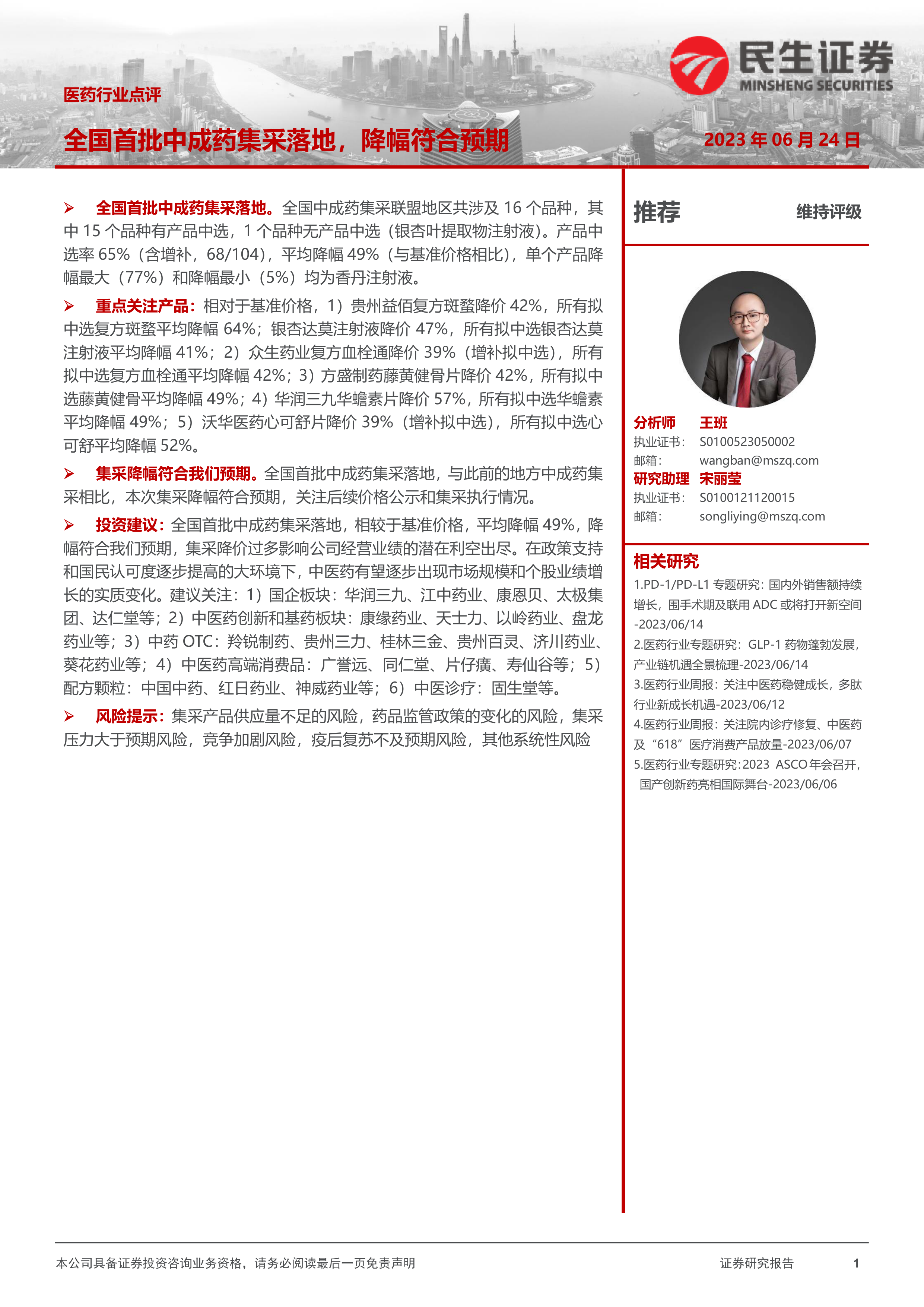 本次全国首批中成药集采结果显示,平均降幅49%,符合预期。集采降价的潜在利空已基本出尽。在政策支持和国民认可度提升的大环境下,中医药行业发展前景向好,市场规模和个股业绩有望实现实质性增长。报告建议投资者关注多个细分领域,并密切关注集采政策的后续执行情况以及市场变化。 需要注意的是,报告中提到的投资建议仅供参考,投资者应根据自身情况进行独立判断,并承担相应的投资风险。 报告也提示了集采产品供应量不足、药品监管政策变化、集采压力大于预期、竞争加剧、疫后复苏不及预期以及其他系统性风险等潜在风险。