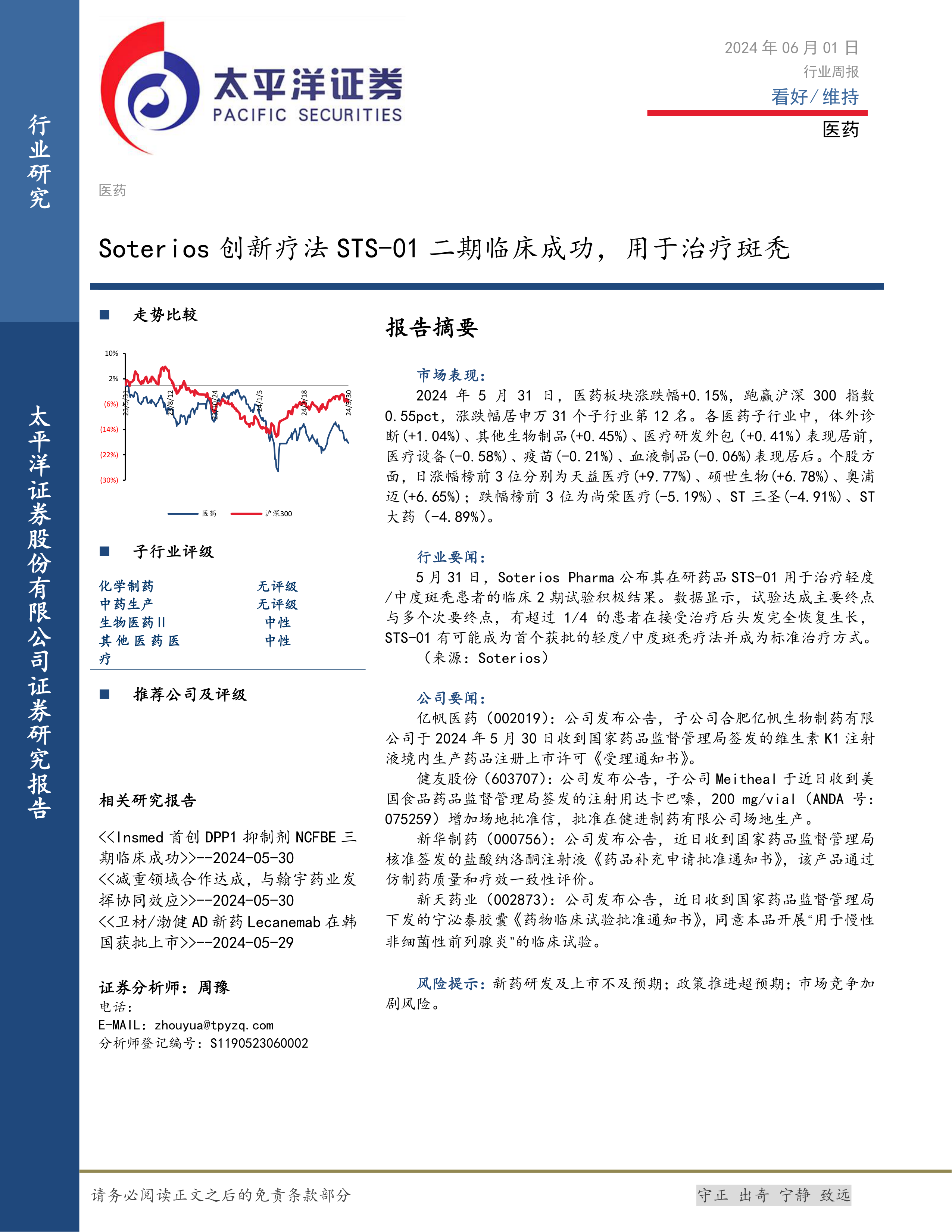 本周医药行业整体表现平稳,但个股涨跌分化明显。Soterios公司创新疗法STS-01二期临床试验的成功是本周行业最重大的事件之一,有望推动斑秃治疗领域的创新发展。不同子行业表现差异显著,部分子行业表现强劲,部分子行业表现相对滞后。 投资者需关注创新疗法的进展、政策变化以及公司基本面等因素,谨慎做出投资决策。 报告中提到的公司新闻为投资者提供了重要的参考信息,但投资者仍需进行独立的判断和分析。 未来,持续关注创新药研发进展、政策监管变化以及市场竞争格局将对医药行业投资至关重要。