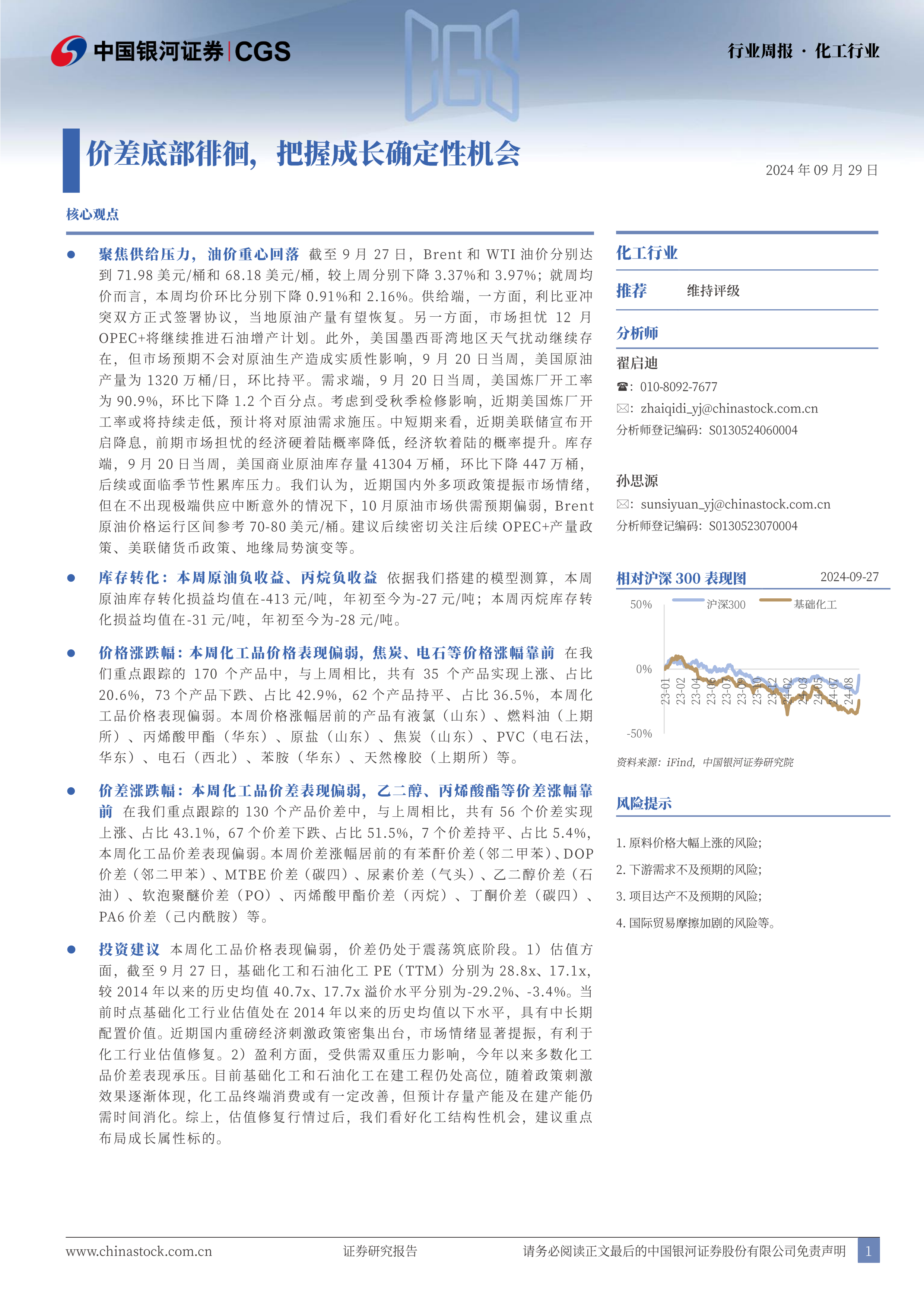 投资建议本周化工品价格表现偏弱,价差仍处于震荡筑底阶段。1)估值方面,截至9月27日,基础化工和石油化工PE(TTM)分别为28.8x、17.1x,较2014年以来的历史均值40.7x、17.7x溢价水平分别为-29.2%、-3.4%。当前时点基础化工行业估值处在2014年以来的历史均值以下水平,具有中长期配置价值。近期国内重磅经济刺激政策密集出台,市场情绪显著提振,有利于化工行业估值修复。2)盈利方面,受供需双重压力影响,今年以来多数化工品价差表现承压。目前基础化工和石油化工在建工程仍处高位,随着政策刺激效果逐渐体现,化工品终端消费或有一定改善,但预计存量产能及在建产能仍需时间消化。综上,估值修复行情过后,我们看好化工结构性机会,建议重点布局成长属性标的。