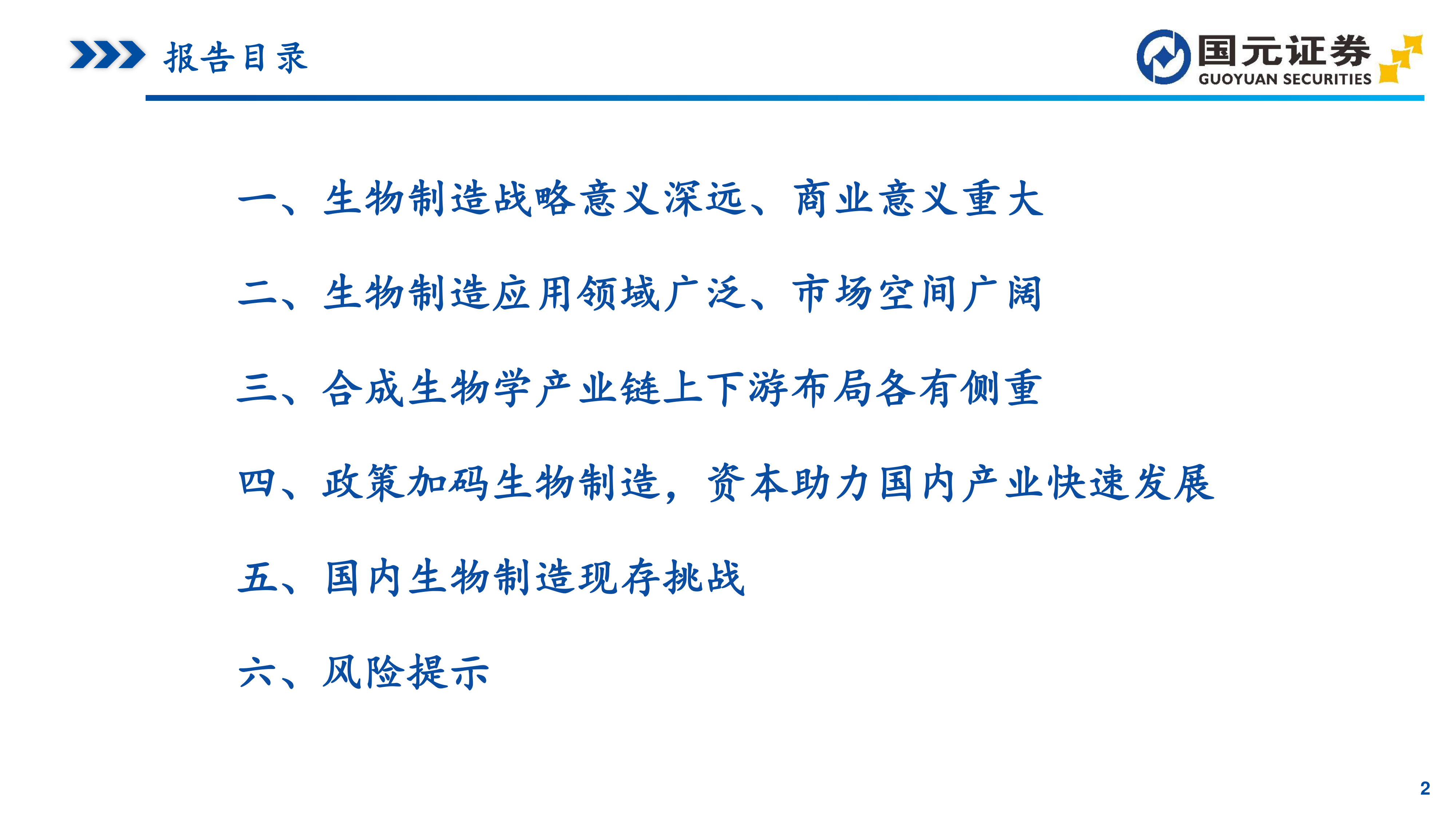本报告的核心观点是:合成生物学作为一门新兴交叉学科,具有深远的战略意义和重大的商业价值,其应用领域广泛,市场空间巨大,未来发展潜力巨大。然而,我国合成生物学产业发展也面临着产业化进度、市场竞争、原材料成本波动以及地缘政治等风险。报告建议关注具备选品眼光和量产能力的企业,并指出政府政策支持和资本助力对推动国内产业快速发展至关重要。