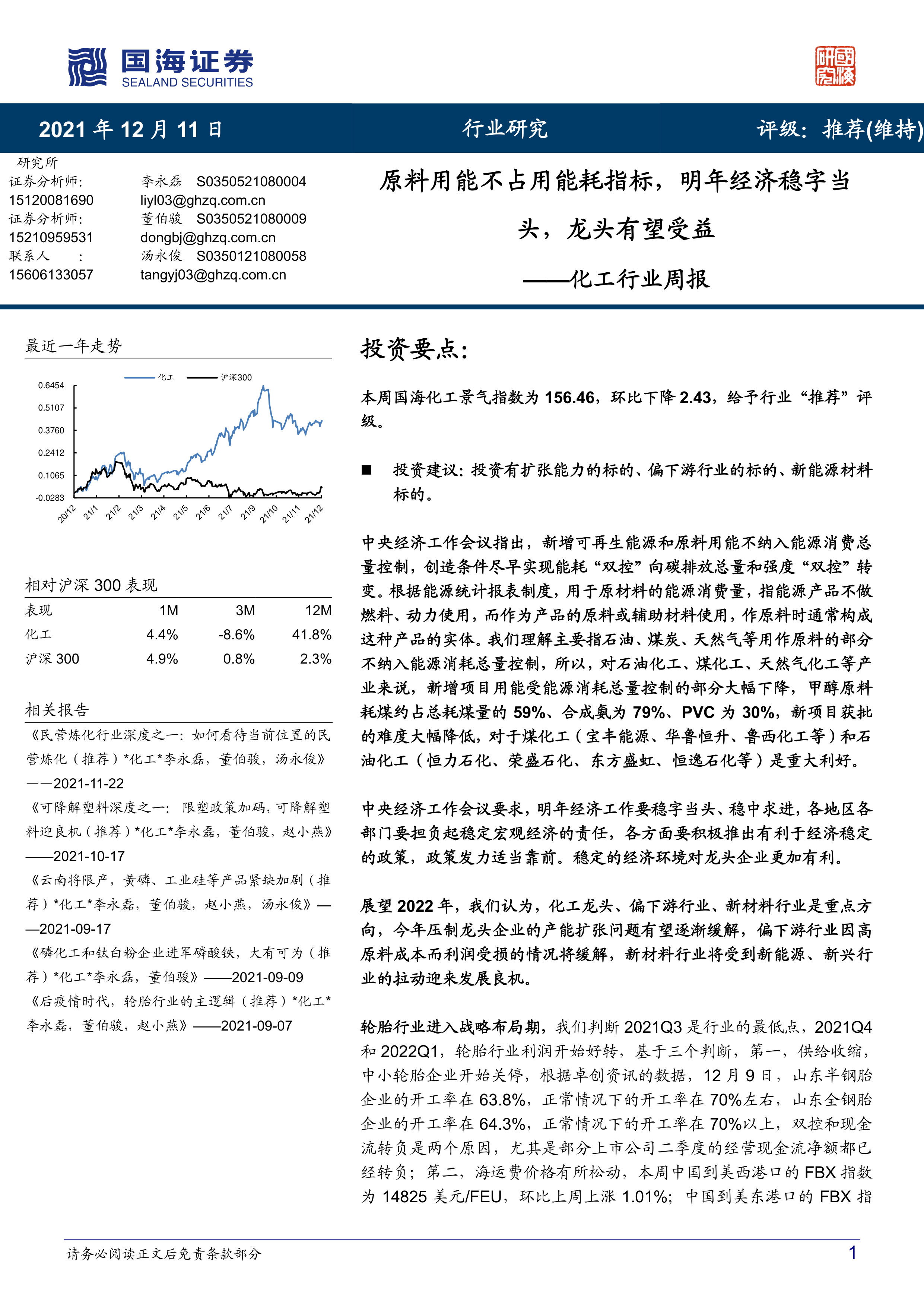 本报告基于对2021年化工行业周报数据的分析,对中国化工行业2022年的市场走势进行了预测,并对重点公司进行了跟踪和评级。 报告认为,原料用能政策的调整和稳定的经济环境将有利于化工龙头企业的发展,建议投资者关注具有扩张能力、偏下游行业以及新能源材料领域的化工企业。 报告中提供的详细数据和分析,为投资者提供了重要的参考信息。 然而,投资者仍需注意报告中提到的风险提示,并根据自身情况进行独立判断和决策。
