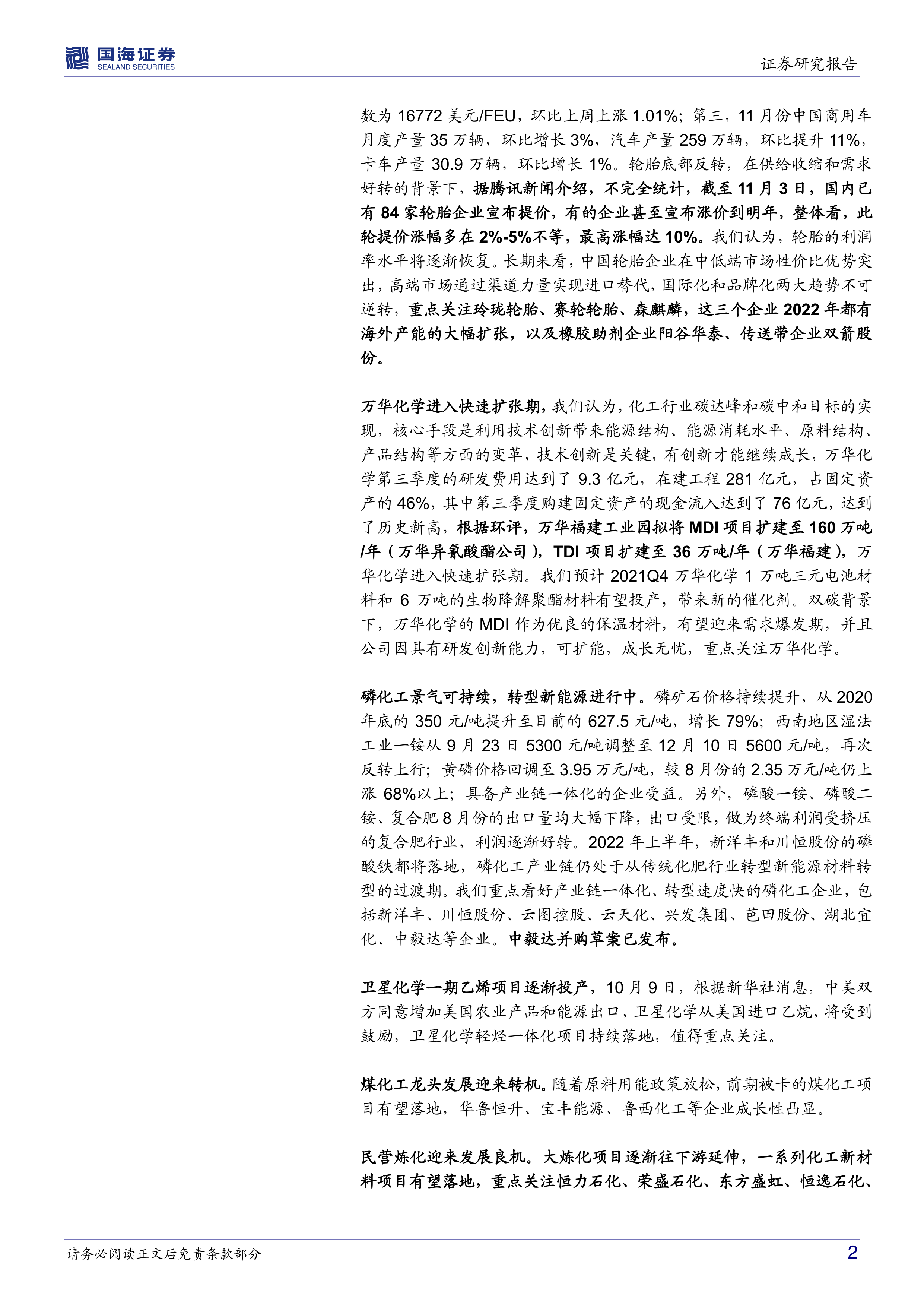 轮胎行业进入战略布局期,我们判断2021Q3是行业的最低点,2021Q4和2022Q1,轮胎行业利润开始好转,基于三个判断,第一,供给收缩,中小轮胎企业开始关停,根据卓创资讯的数据,12月9日,山东半钢胎企业的开工率在63.8%,正常情况下的开工率在70%左右,山东全钢胎企业的开工率在64.3%,正常情况下的开工率在70%以上,双控和现金流转负是两个原因,尤其是部分上市公司二季度的经营现金流净额都已经转负;第二,海运费价格有所松动,本周中国到美西港口的FBX指数为14825美元/FEU,环比上周上涨1.01%;中国到美东港口的FBX指数为16772美元/FEU,环比上周上涨1.01%;第三,11月份中国商用车月度产量35万辆,环比增长3%,汽车产量259万辆,环比提升11%,卡车产量30.9万辆,环比增长1%。轮胎底部反转,在供给收缩和需求好转的背景下,据腾讯新闻介绍,不完全统计,截至11月3日,国内已有84家轮胎企业宣布提价,有的企业甚至宣布涨价到明年,整体看,此轮提价涨幅多在2%-5%不等,最高涨幅达10%。我们认为,轮胎的利润率水平将逐渐恢复。长期来看,中国轮胎企业在中低端市场性价比优势突出,高端市场通过渠道力量实现进口替代,国际化和品牌化两大趋势不可逆转,重点关注玲珑轮胎、赛轮轮胎、森麒麟,这三个企业2022年都有海外产能的大幅扩张,以及橡胶助剂企业阳谷华泰、传送带企业双箭股份。