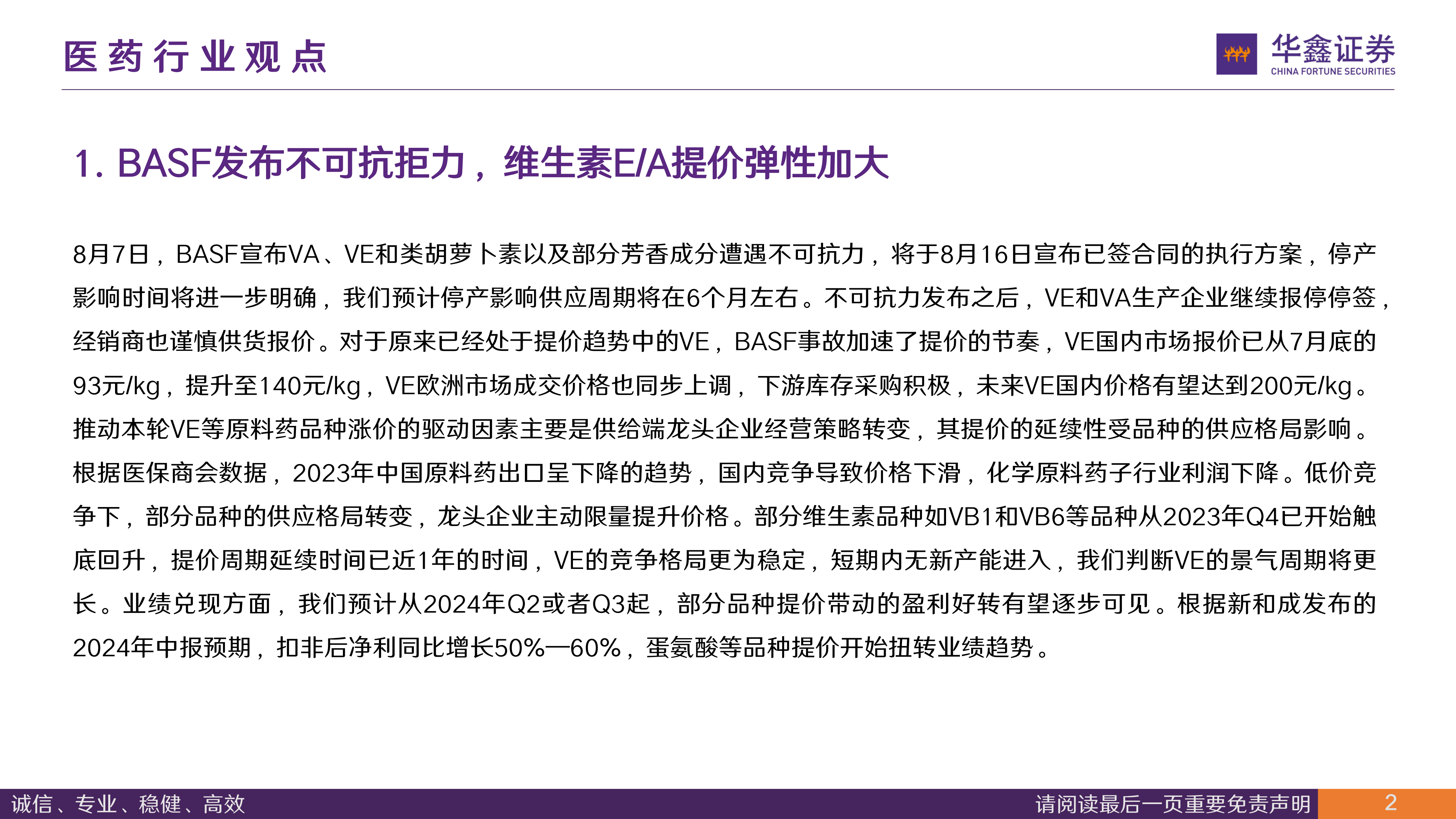 8月7日,BASF宣布VA、VE和类胡萝卜素以及部分芳香成分遭遇不可抗力,将于8月16日宣布已签合同的执行方案,停产影响时间将进一步明确,我们预计停产影响供应周期将在6个月左右。不可抗力发布之后,VE和VA生产企业继续报停停签,经销商也谨慎供货报价。对于原来已经处于提价趋势中的VE,BASF事故加速了提价的节奏,VE国内市场报价已从7月底的93元/kg,提升至140元/kg,VE欧洲市场成交价格也同步上调,下游库存采购积极,未来VE国内价格有望达到200元/kg。推动本轮VE等原料药品种涨价的驱动因素主要是供给端龙头企业经营策略转变,其提价的延续性受品种的供应格局影响。根据医保商会数据,2023年中国原料药出口呈下降的趋势,国内竞争导致价格下滑,化学原料药子行业利润下降。低价竞争下,部分品种的供应格局转变,龙头企业主动限量提升价格。部分维生素品种如VB1和VB6等品种从2023年Q4已开始触底回升,提价周期延续时间已近1年的时间,VE的竞争格局更为稳定,短期内无新产能进入,我们判断VE的景气周期将更长。业绩兑现方面,我们预计从2024年Q2或者Q3起,部分品种提价带动的盈利好转有望逐步可见。根据新和成发布的2024年中报预期,扣非后净利同比增长50%—60%,蛋氨酸等品种提价开始扭转业绩趋势。