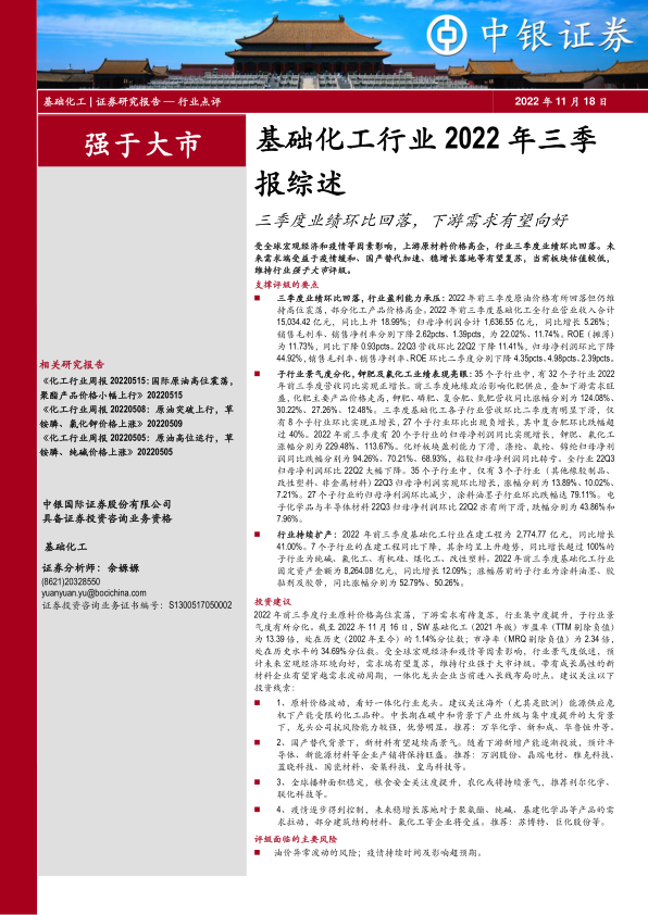 基础化工行业2022年三季报综述:三季度业绩环比回落,下游需求有望向好