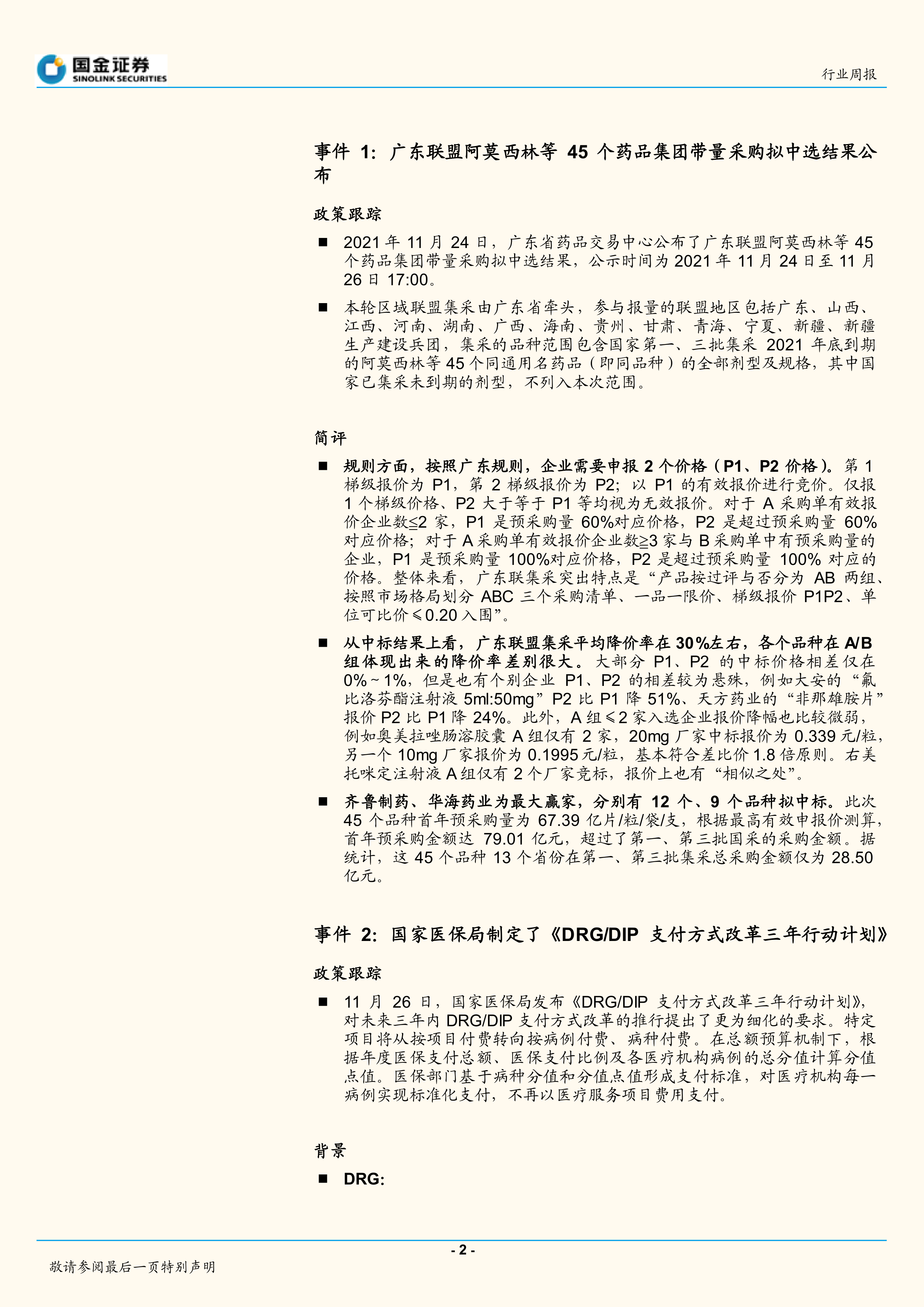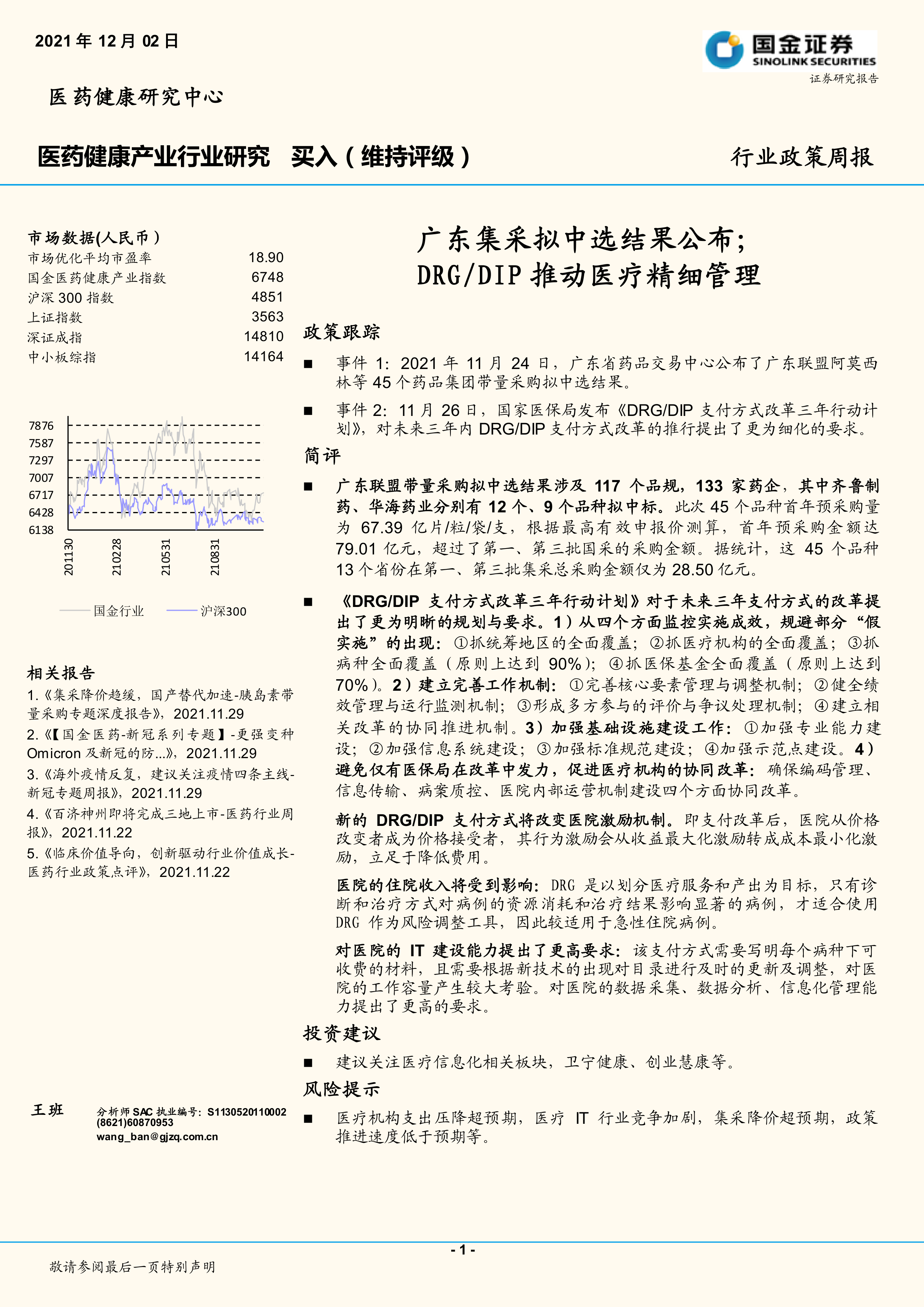 医药健康产业行业研究:广东集采拟中选结果公布;DRG/DIP推动医疗精细管理