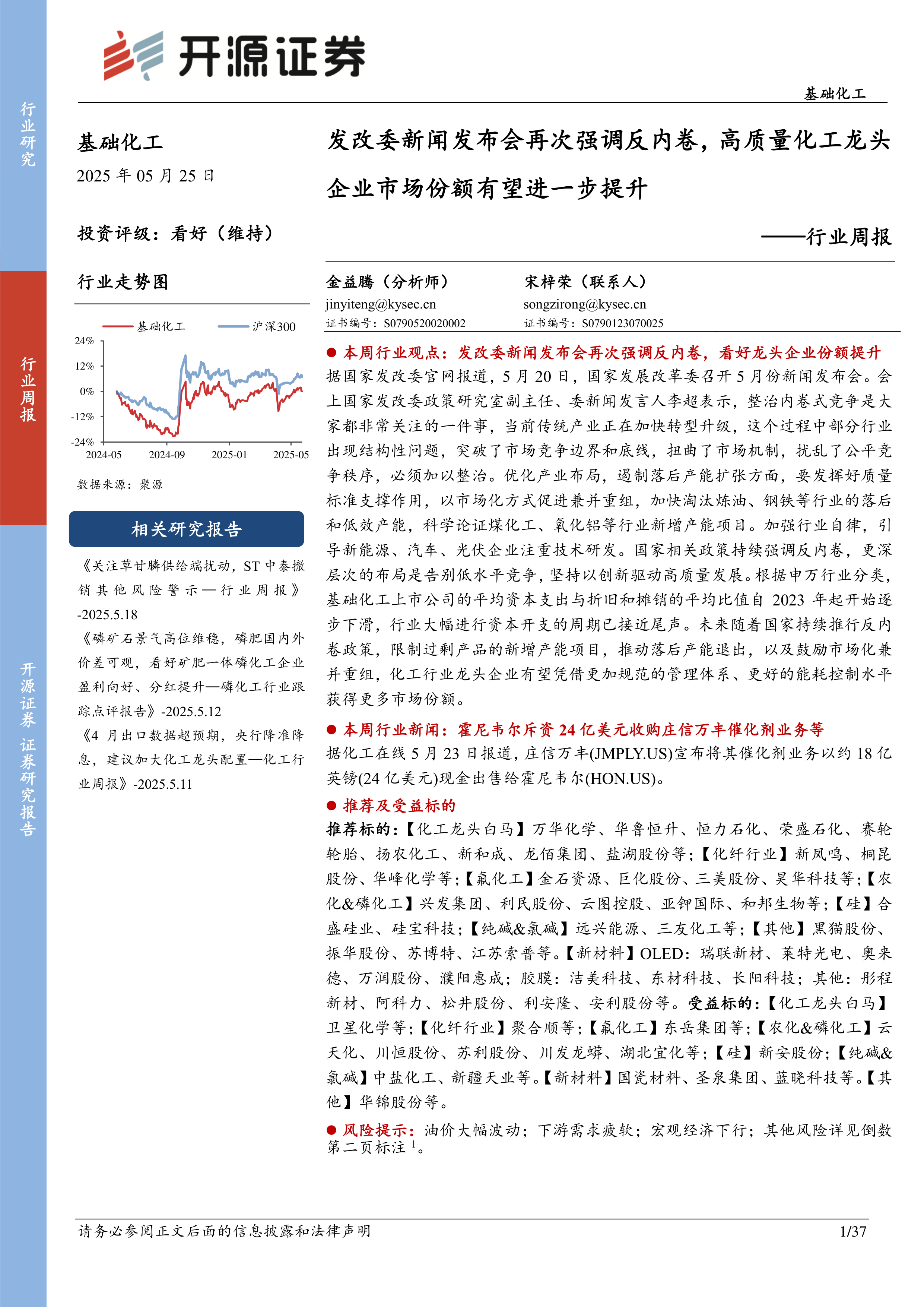 本周行业观点:发改委新闻发布会再次强调反内卷,看好龙头企业份额提升据国家发改委官网报道,5月20日,国家发展改革委召开5月份新闻发布会。会上国家发改委政策研究室副主任、委新闻发言人李超表示,整治内卷式竞争是大家都非常关注的一件事,当前传统产业正在加快转型升级,这个过程中部分行业出现结构性问题,突破了市场竞争边界和底线,扭曲了市场机制,扰乱了公平竞争秩序,必须加以整治。优化产业布局,遏制落后产能扩张方面,要发挥好质量标准支撑作用,以市场化方式促进兼并重组,加快淘汰炼油、钢铁等行业的落后和低效产能,科学论证煤化工、氧化铝等行业新增产能项目。加强行业自律,引导新能源、汽车、光伏企业注重技术研发。国家相关政策持续强调反内卷,更深层次的布局是告别低水平竞争,坚持以创新驱动高质量发展。根据申万行业分类,基础化工上市公司的平均资本支出与折旧和摊销的平均比值自2023年起开始逐步下滑,行业大幅进行资本开支的周期已接近尾声。未来随着国家持续推行反内卷政策,限制过剩产品的新增产能项目,推动落后产能退出,以及鼓励市场化兼并重组,化工行业龙头企业有望凭借更加规范的管理体系、更好的能耗控制水平获得更多市场份额。