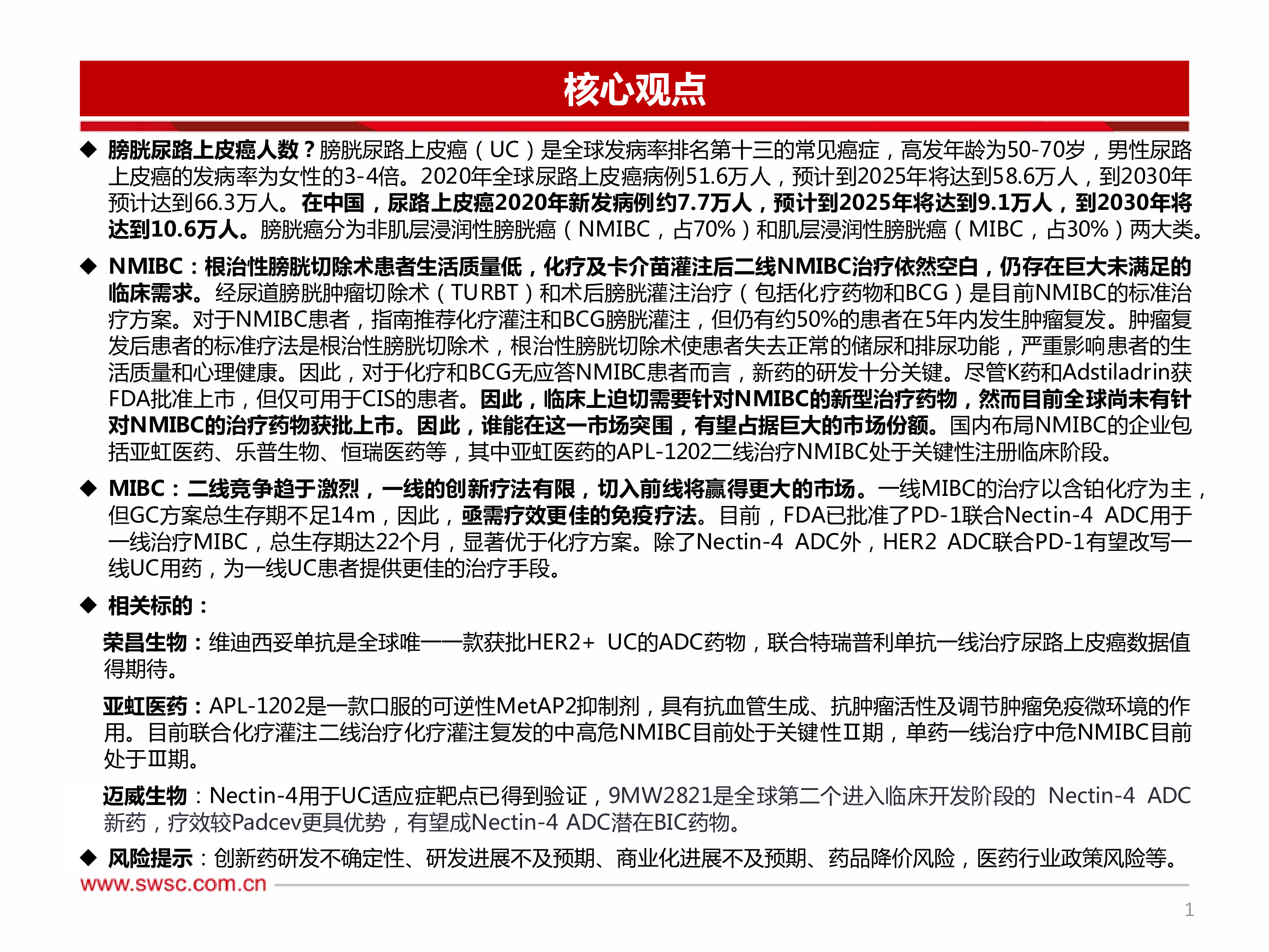 本报告的核心观点是:膀胱尿路上皮癌(UC)市场存在巨大未满足的临床需求,尤其体现在非肌层浸润性膀胱癌(NMIBC)的二线治疗和肌层浸润性膀胱癌(MIBC)的一线治疗方面。 NMIBC领域,现有治疗方案复发率高,生活质量差,二线治疗药物匮乏;MIBC领域,一线治疗方案疗效有限,亟需疗效更佳的免疫疗法。 因此,针对NMIBC和MIBC的新型治疗药物研发及市场竞争将持续升温,为相关企业带来巨大的市场机遇,但也面临着创新药研发的不确定性、研发进展不及预期、商业化进展不及预期、药品降价风险以及医药行业政策风险等挑战。