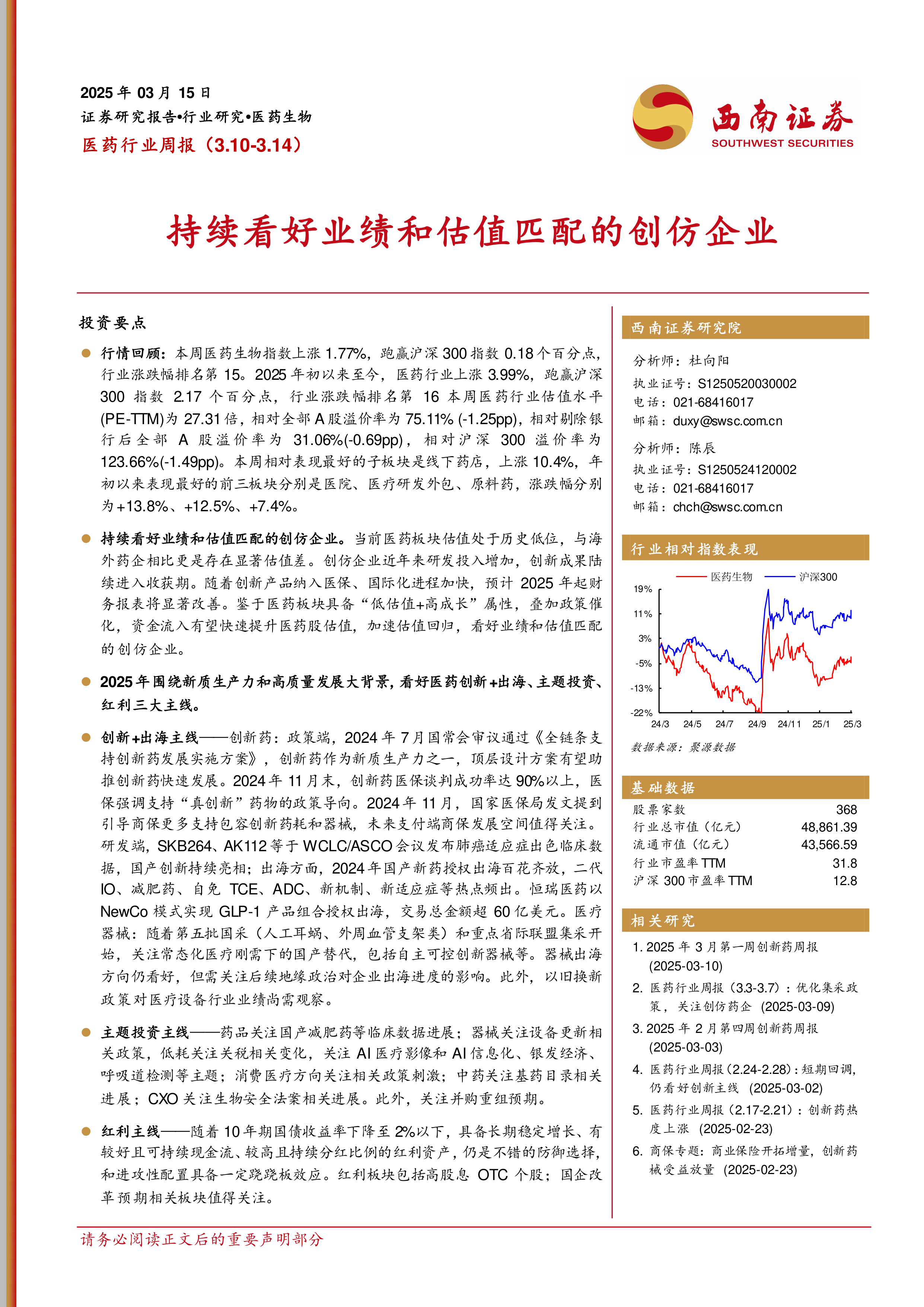 医药行业周报:持续看好业绩和估值匹配的创仿企业