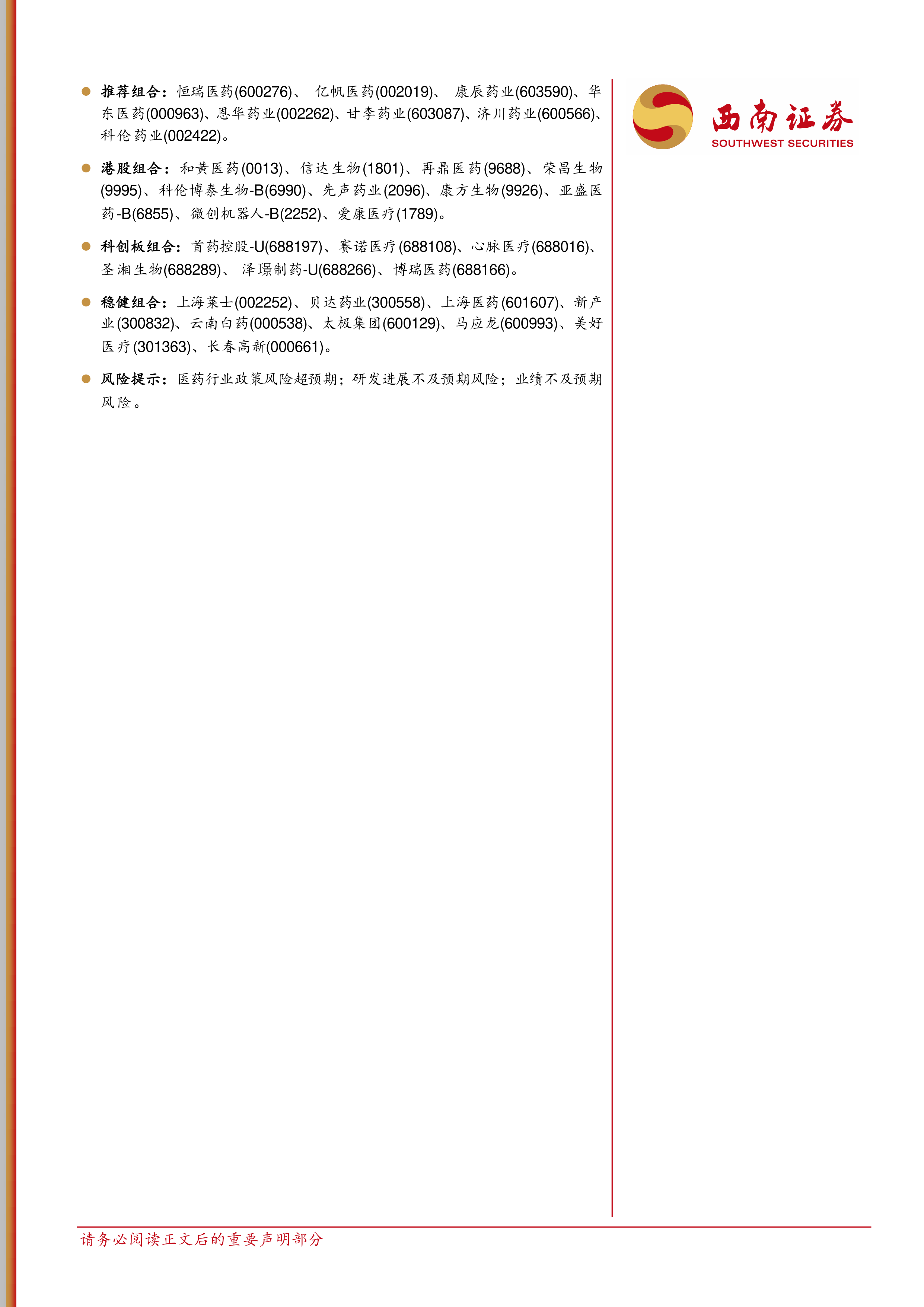 风险提示:医药行业政策风险超预期;研发进展不及预期风险;业绩不及预期风险。